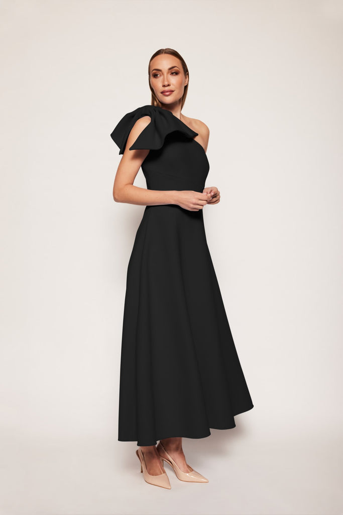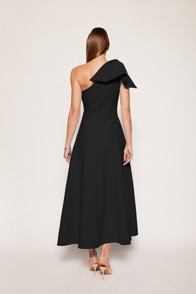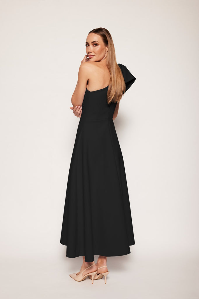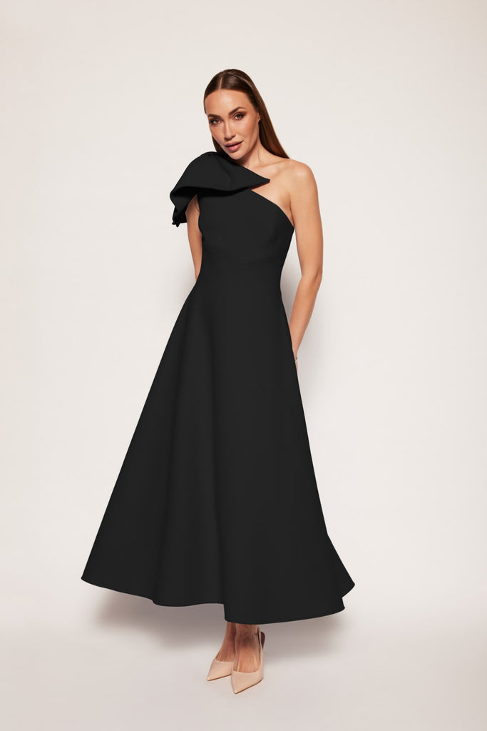 An elegant, fitted top silhouette with an asymmetric neckline joined with an a-line pocketed skirt. The one-shoulder design is accessorised by an understated bow detail that drops around the front and back of the shoulder.