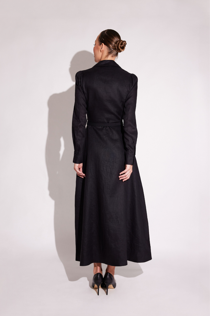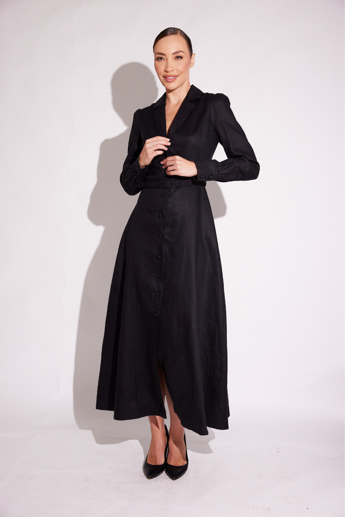 Upgrade your wardrobe with our sophisticated long linen dress. Meticulously tailored from breathable linen fabric, it boasts a refined collared neckline and a row of delicate covered buttons, exuding timeless elegance. Define your silhouette with the coordinating belt. With its long sleeves, this versatile and chic dress effortlessly transitions from day to evening, ensuring you look impeccable for any occasion.