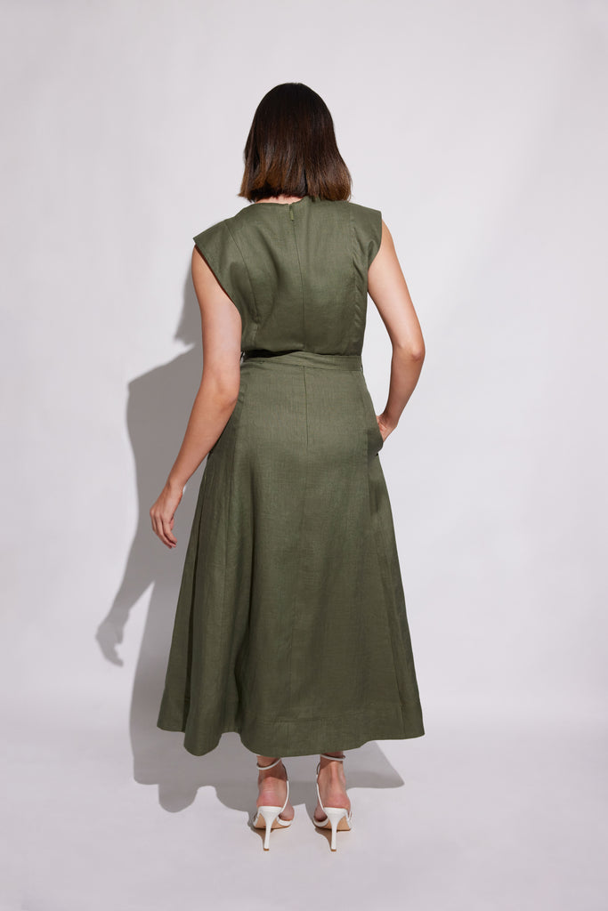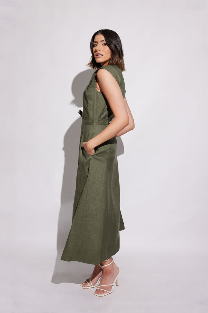 Discover the Infinite Dress: a versatile belted midi with a striking V neckline and sleeveless design. Featuring vertical cap detailing that gracefully extends to the waist seam, this dress is the perfect summer staple for effortless style.