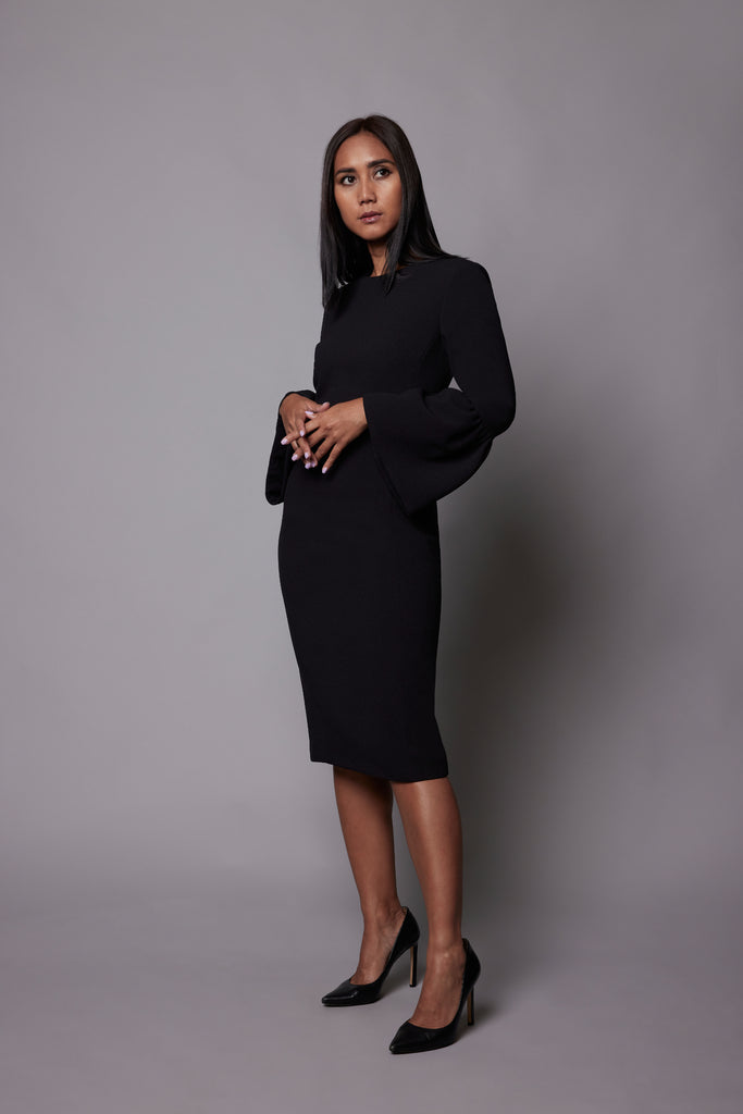 The Demure Dress boasts a simple, structured fit designed to contour the body for a sleek silhouette with elegant bell sleeve detail and below the knee-length skirt crafted in our Premium fabric.