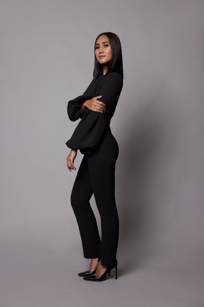 Fully lined and tailored cropped top, long-sleeved finished with statement bubble cuff.