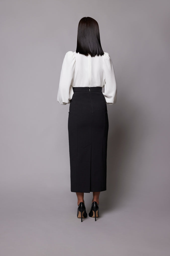 Created from our London fabric, statement collar with peep hole detail, long sleeves with structured cuffs finished off wiht covered buttons.