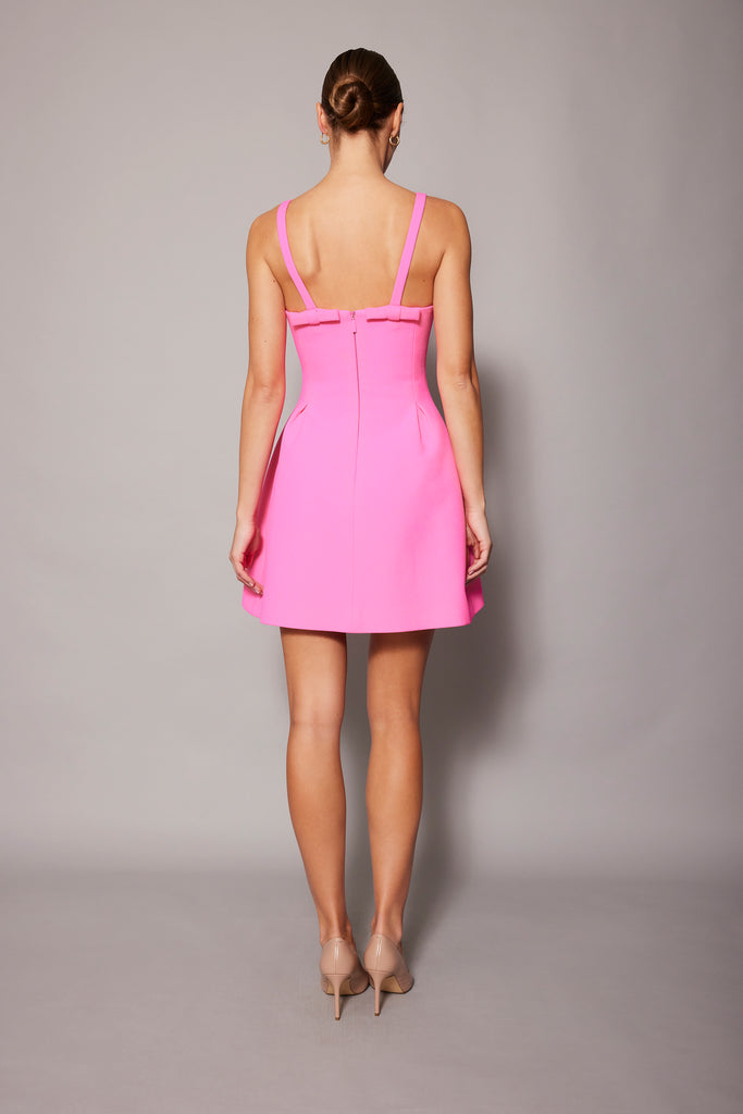 Collared neckline, Below-the-knee length A-line skirt with side pockets, Short puff sleeve with fold detail, Fully lined with structured panelling, Invisible zipper at centre back