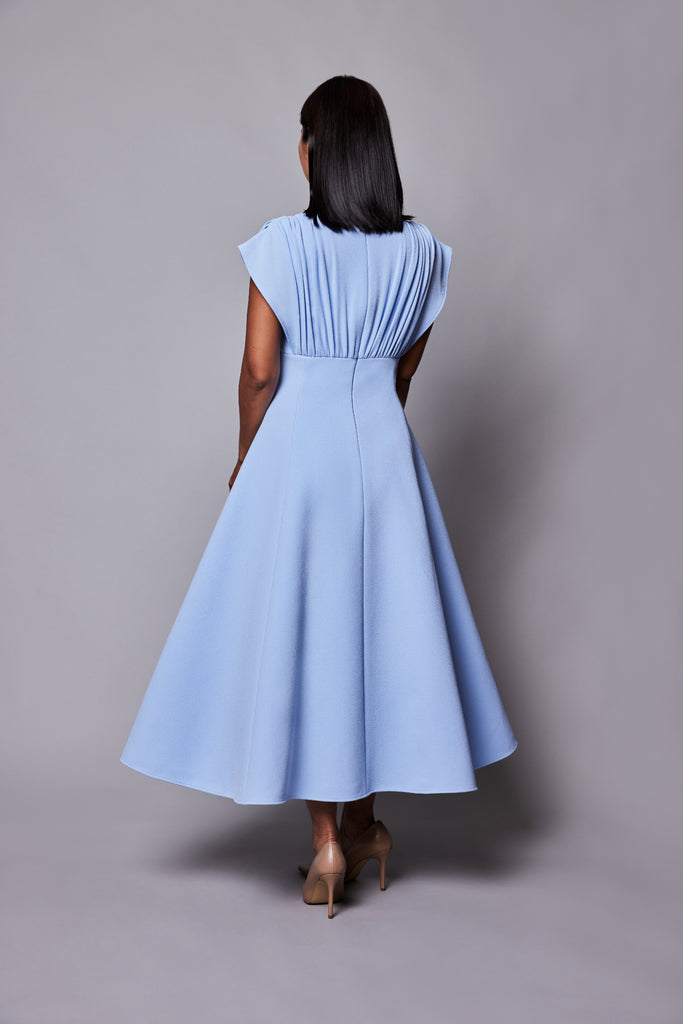 A Waist defining dress with subtle layered london gathering top detail, accentuated by a full mid calf skirt, fully lined.