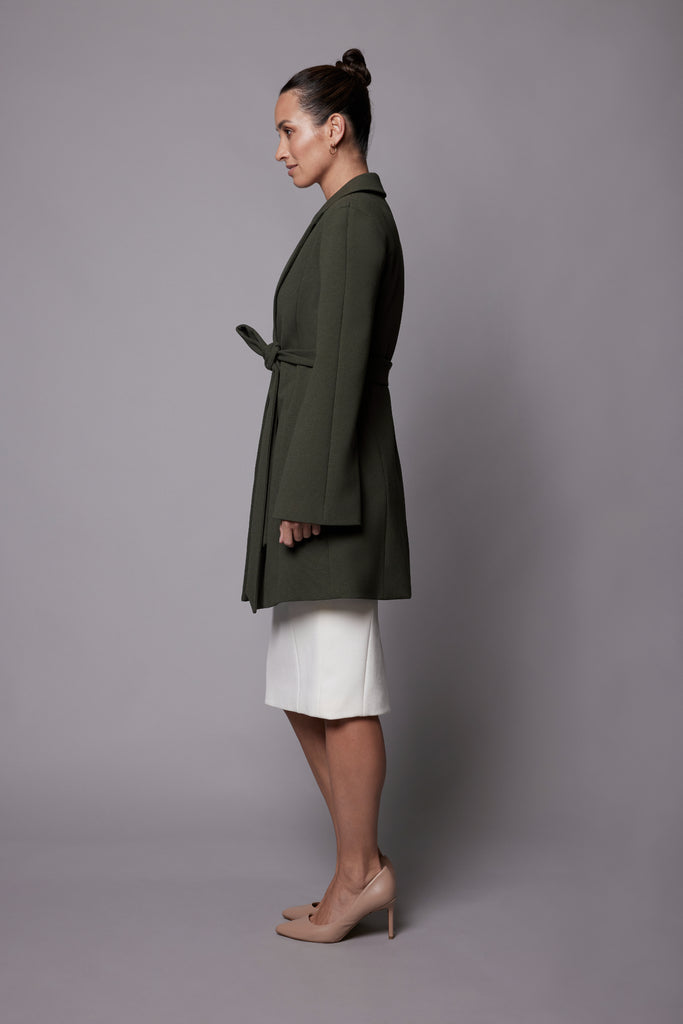 Closed cape with removable self-belt to define waist, 3/4 length with long flared arms, perfect for any occassion.