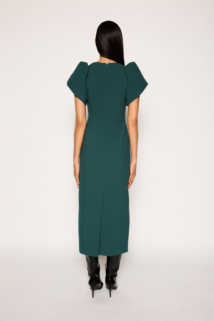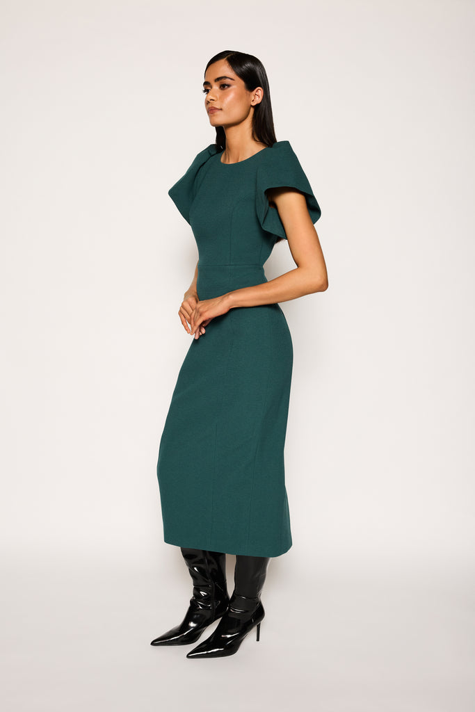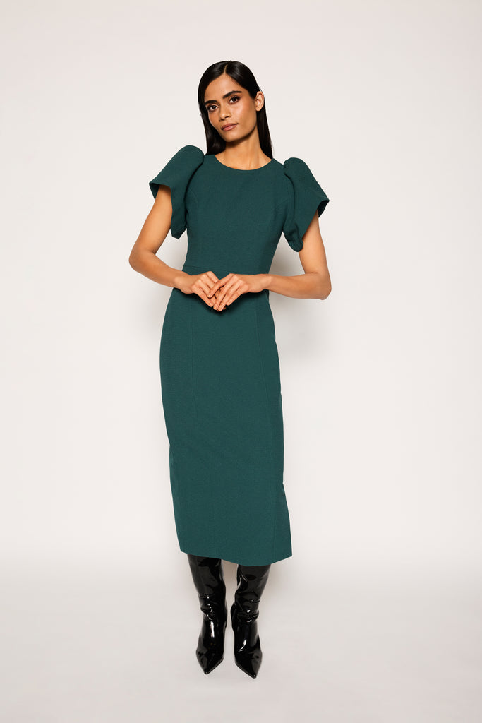 The Ellery Dress. A timeless silhouette with a straight skirt and round neckline, elevated by bold statement puff sleeves for a modern edge.