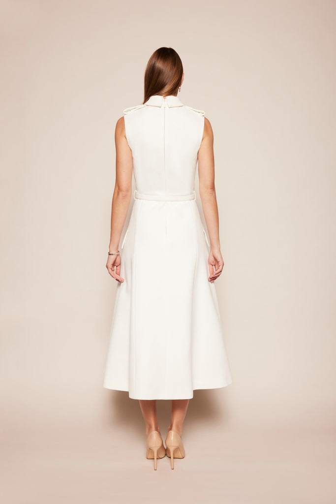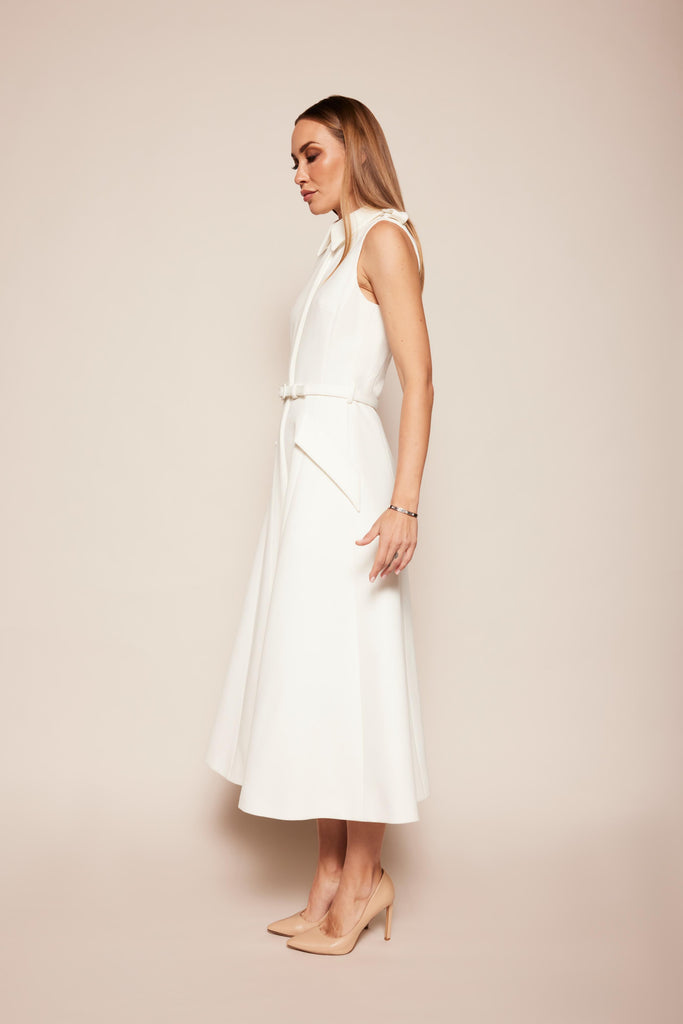 Introducing the Jasmine Dress, a sleeveless collared button down dress detailed with a belt. falling mid calf, with faux pockets this timeless piece looks good season after season.