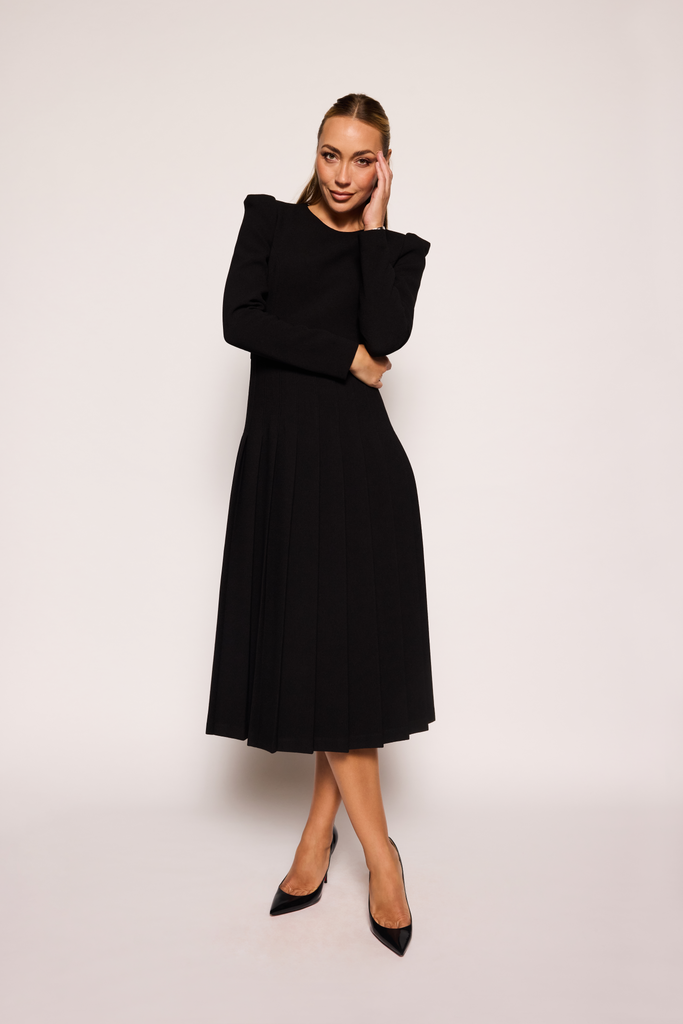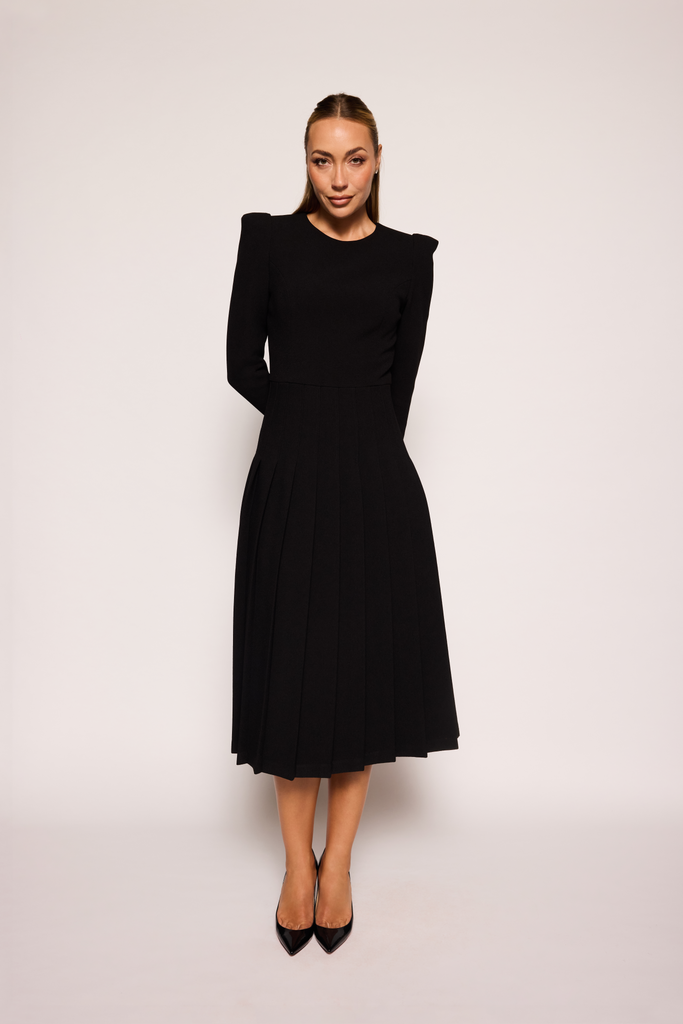 A timeless piece with round neck detail and long sleeves. Beautiful movement in the slight A-line pleated skirt which falls just below the knees. Strategically planned and fully lined.