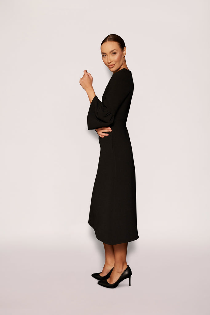 Round neckline, Mid calf length A-line skirt with side pockets, Long bell sleeve, Fully lined bodice with panel detail, Invisible zipper at centre back.