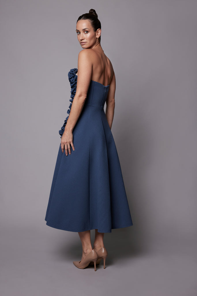Statement strapless full skirt mid-calf length, floral fabric detail, that contours the body, with pockets.