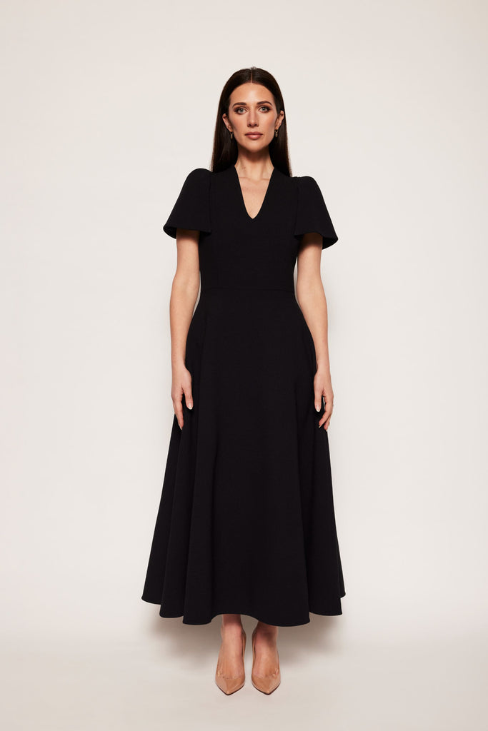 A timeless classic style featuring a deep v-neckline, structured bodice fit with a line skirt, detailed with flouncing sleeves.