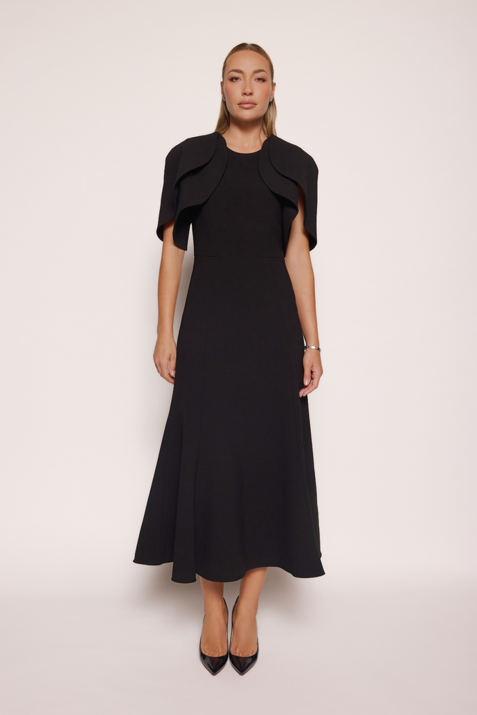 The Niko Dress in black showcases a round neckline paired with cape-like, flowing sleeves, creating an elegant silhouette that extends to mid-calf. This statement piece combines graceful movement with refined design, perfect for sophisticated occasions.