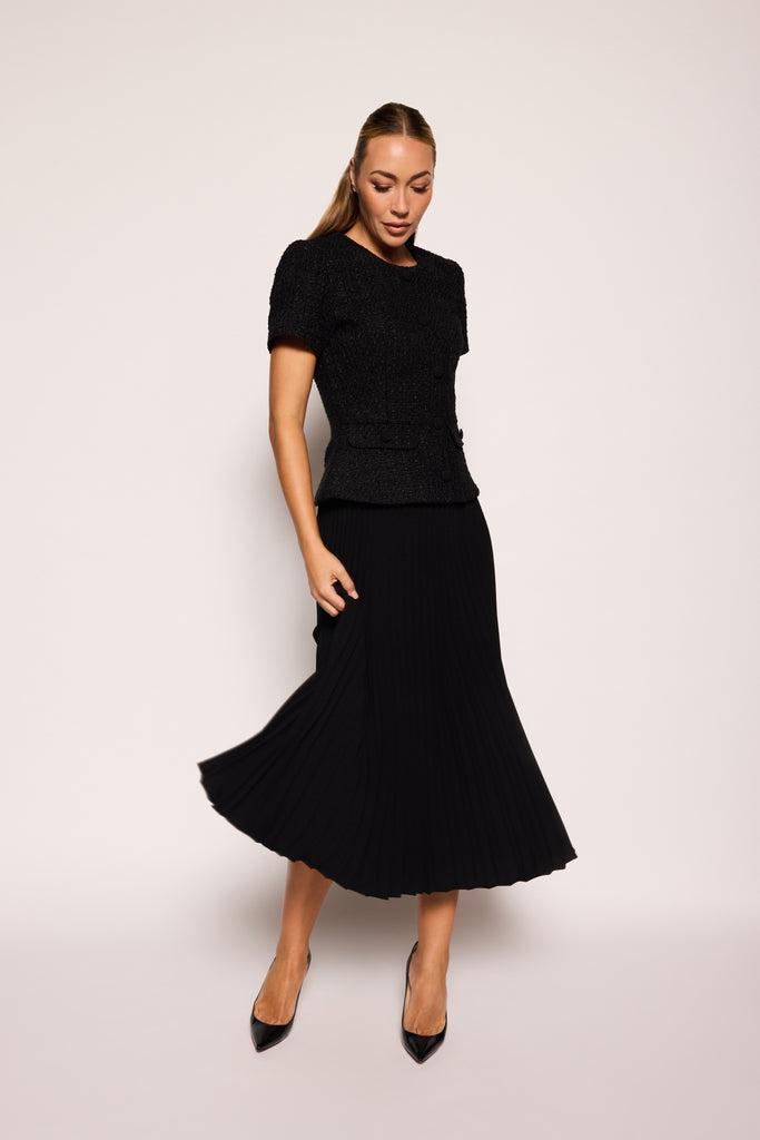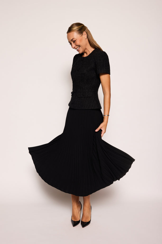 The Portia Dress in black features a finely tailored tweed top that offers a structured, sophisticated silhouette, perfectly complemented by a pleated, flowing skirt that adds movement and grace. This contrast in textures creates a balanced, elegant look ideal for refined occasions, combining classic tailoring with effortless femininity.