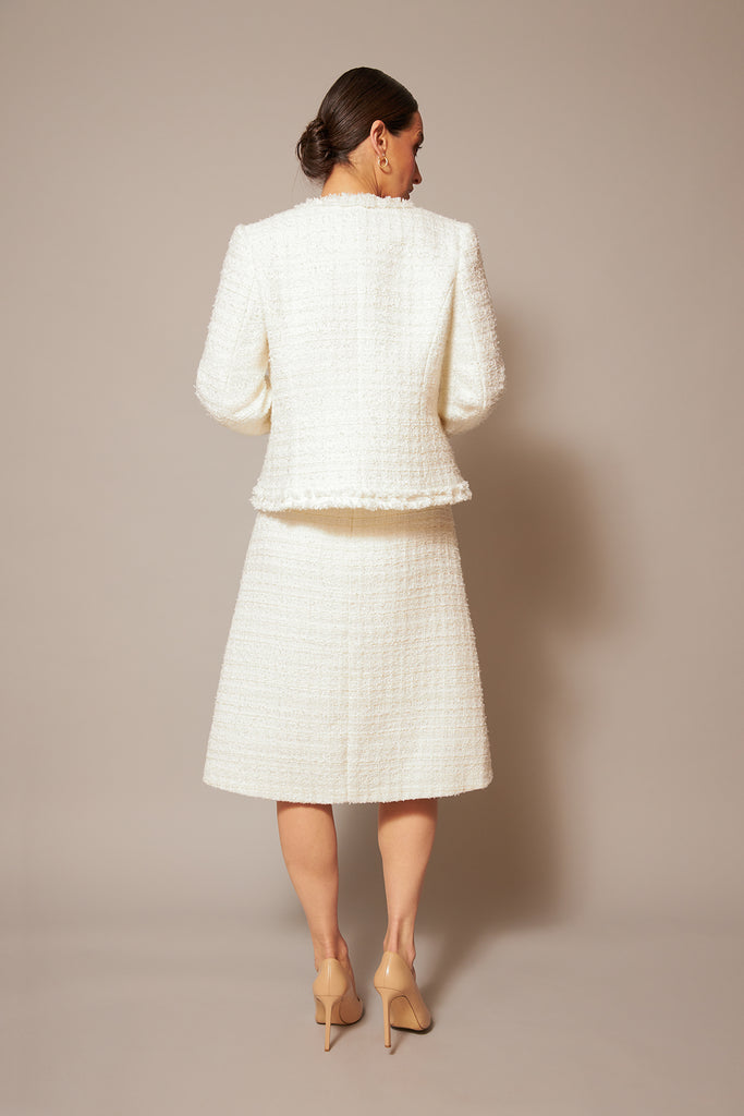 Elevate your wardrobe with The Maya Jacket, crafted from our limited edition tweed, the perfect four pocket square shape emitting chic and classic style . Intricate fraying detail, that can be complementary to any look for work or weekends.