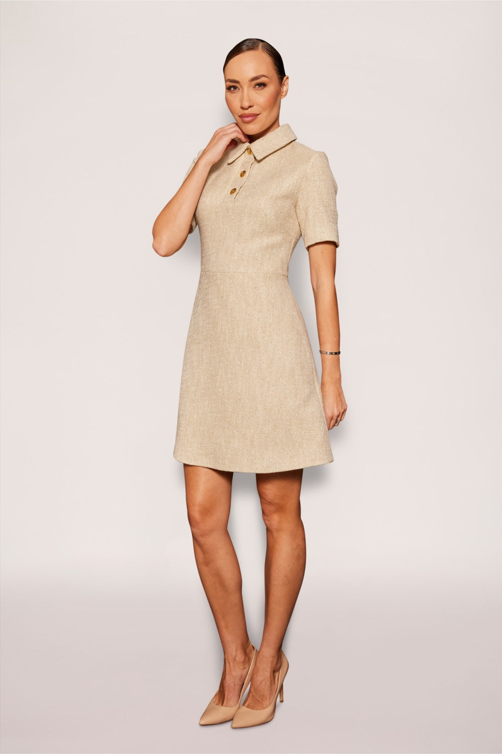 The Banksia Tweed Dress combines classic tweed fabric with contemporary design elements, featuring a structured collar and functional pockets for added style and practicality. Elegant gold KG buttons near the neckline add a refined touch, enhancing its sophisticated mini silhouette.