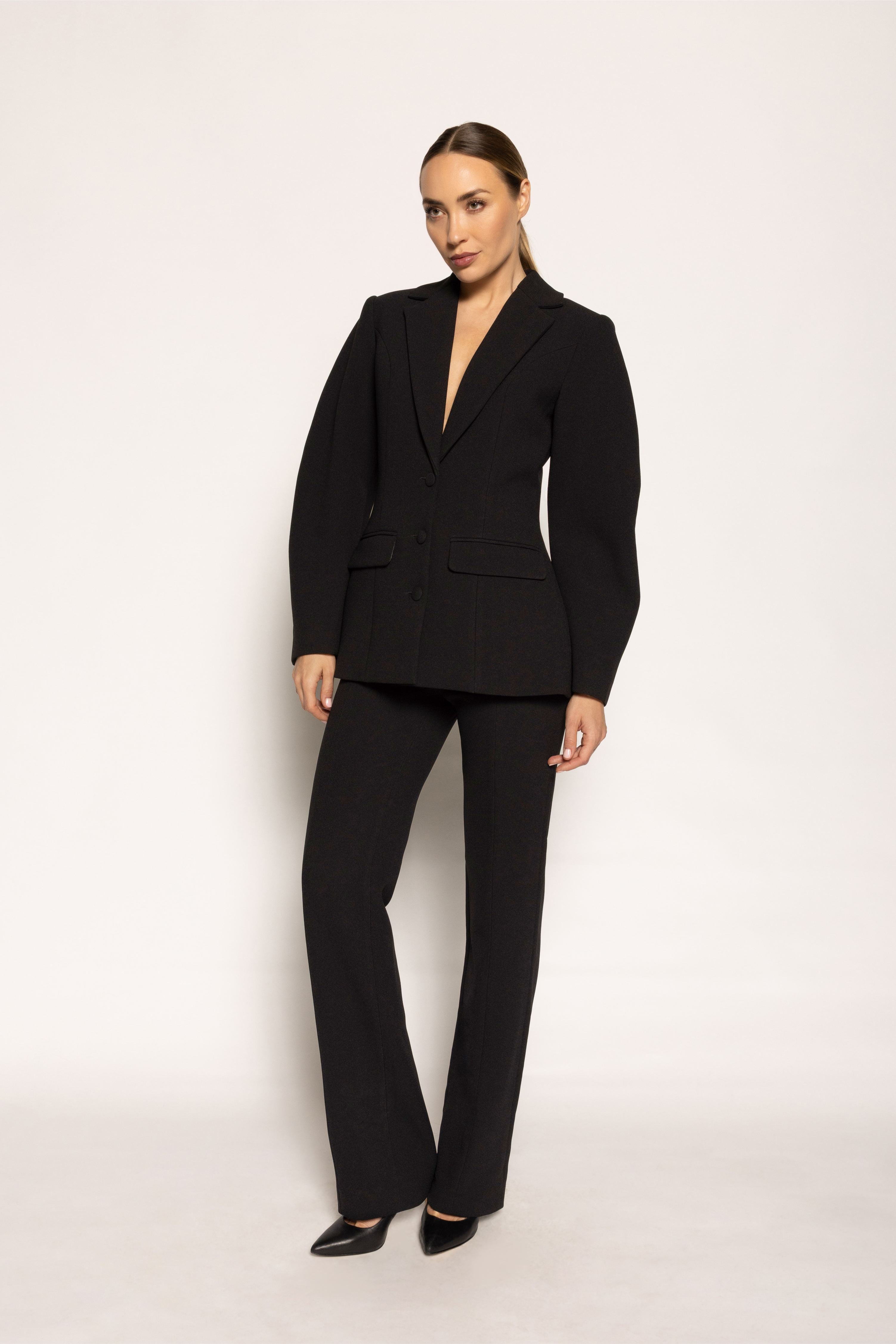 Elevate your wardrobe with this refined single-breasted blazer, expertly tailored to flatter. Structured panelling cinches the waist, creating a graceful silhouette that hugs your curves beautifully. Cut to hip length for versatile styling, it features distinctive barrel sleeves that add contemporary polish. Fully lined for comfort and durability, this sophisticated piece transitions seamlessly from boardroom to evening occasions.