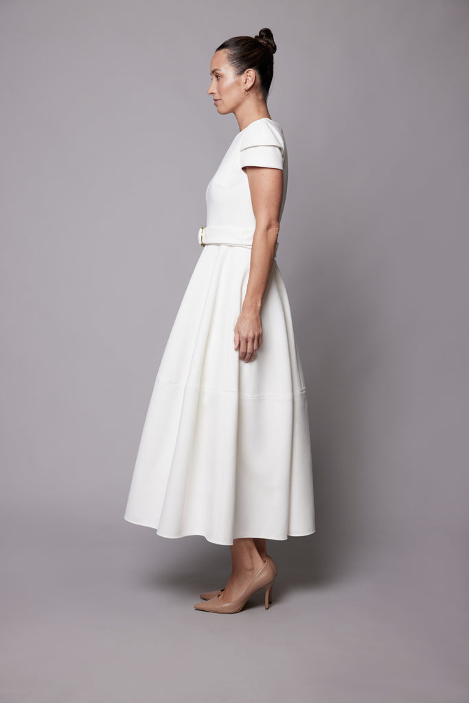 This elegant statement piece featuring a full skirt with structured panels for a flawless silhouette, double-capped sleeves detail, finished off with a self belt with KG buckle.
