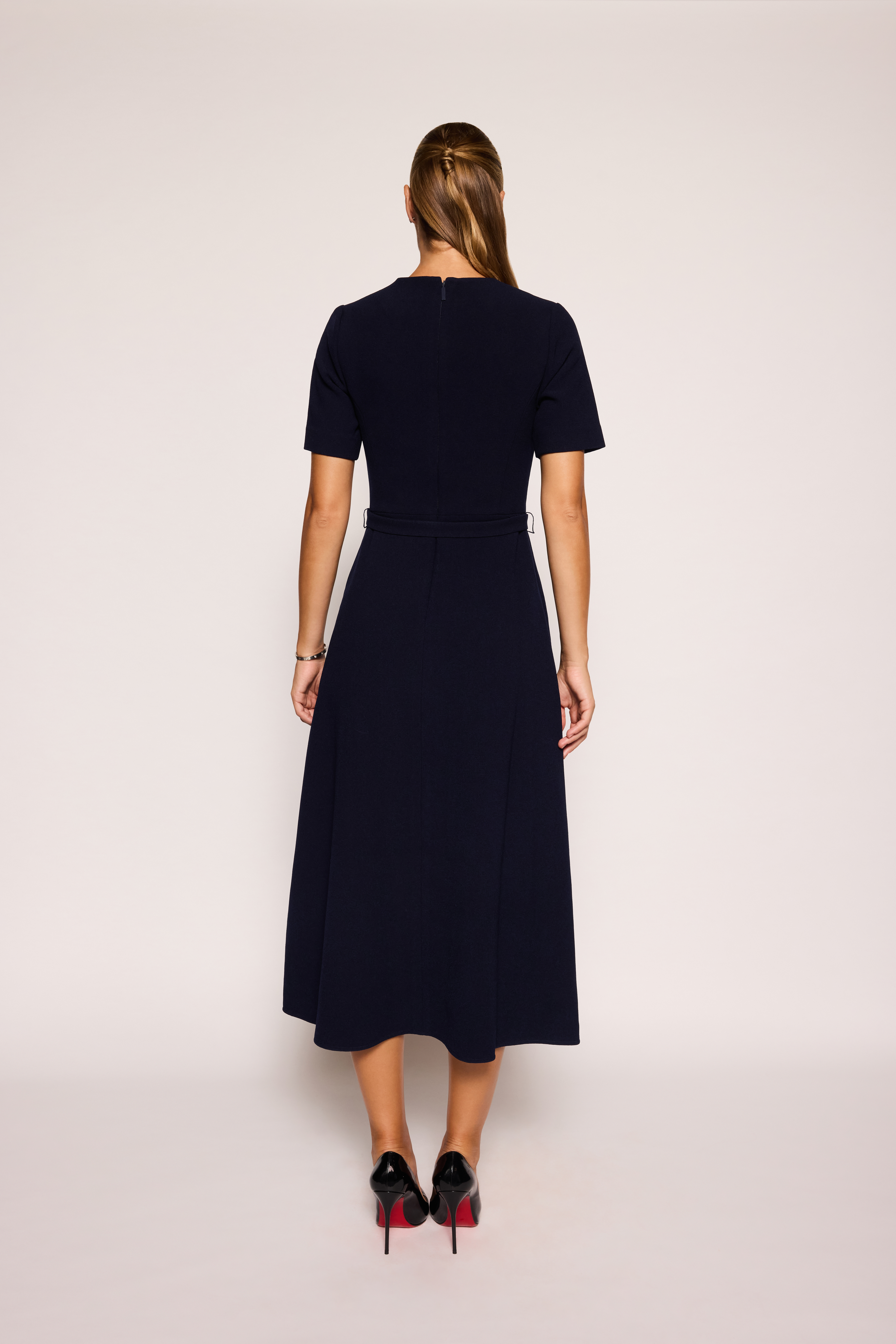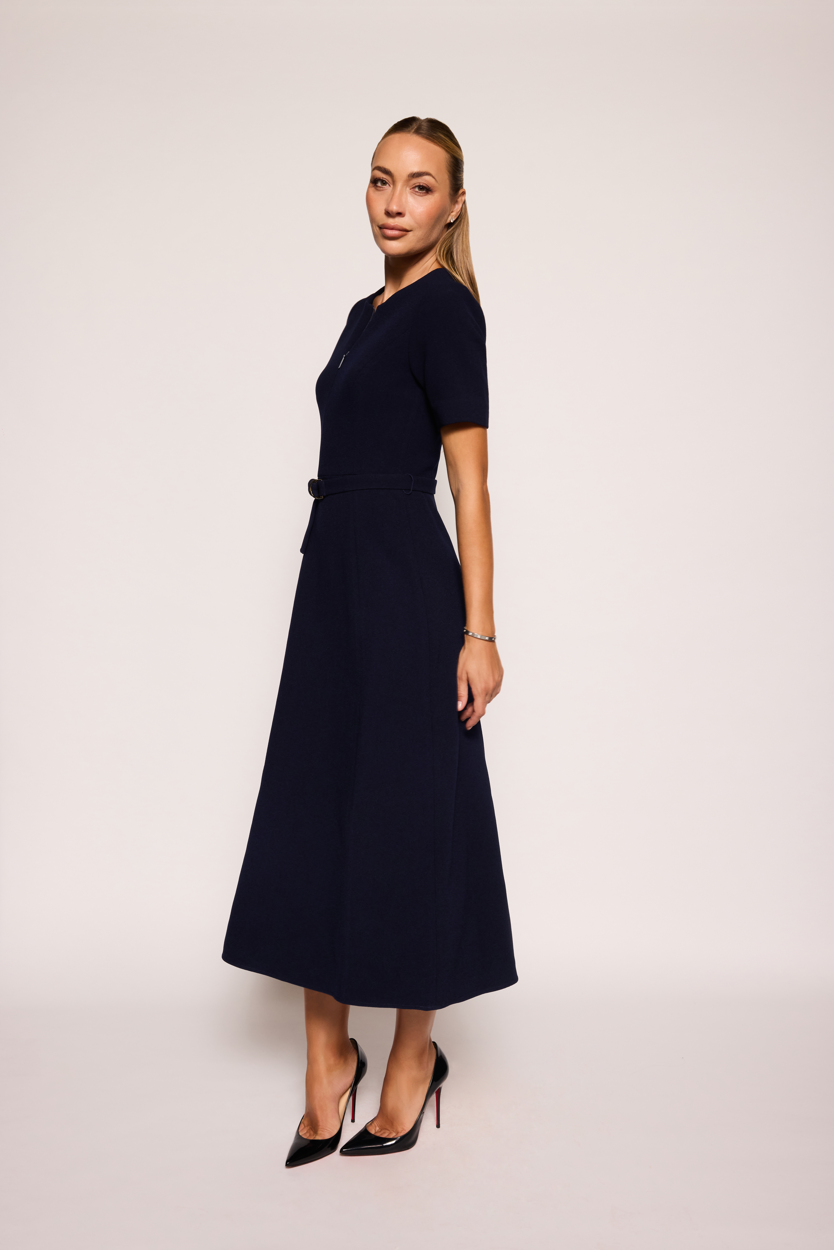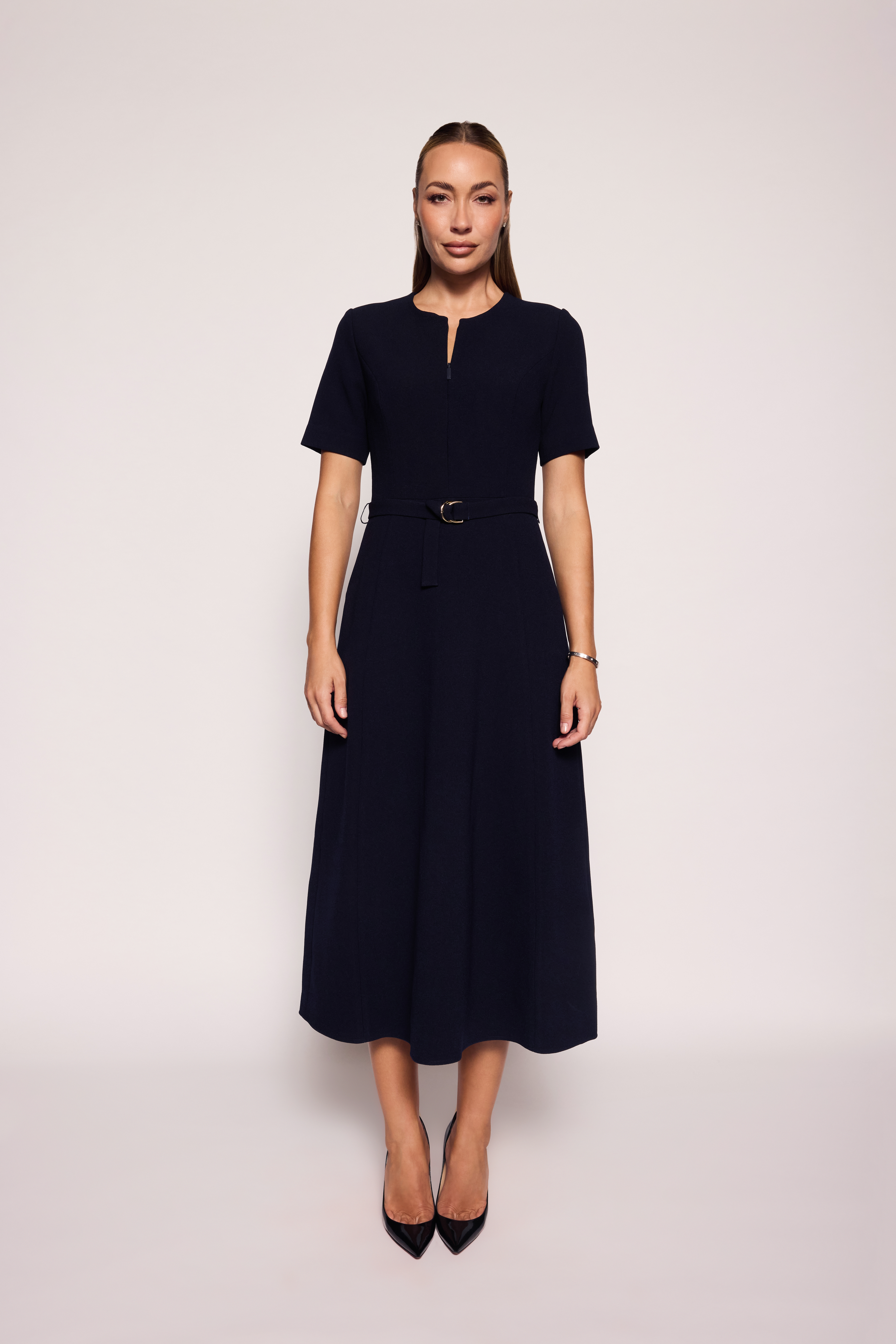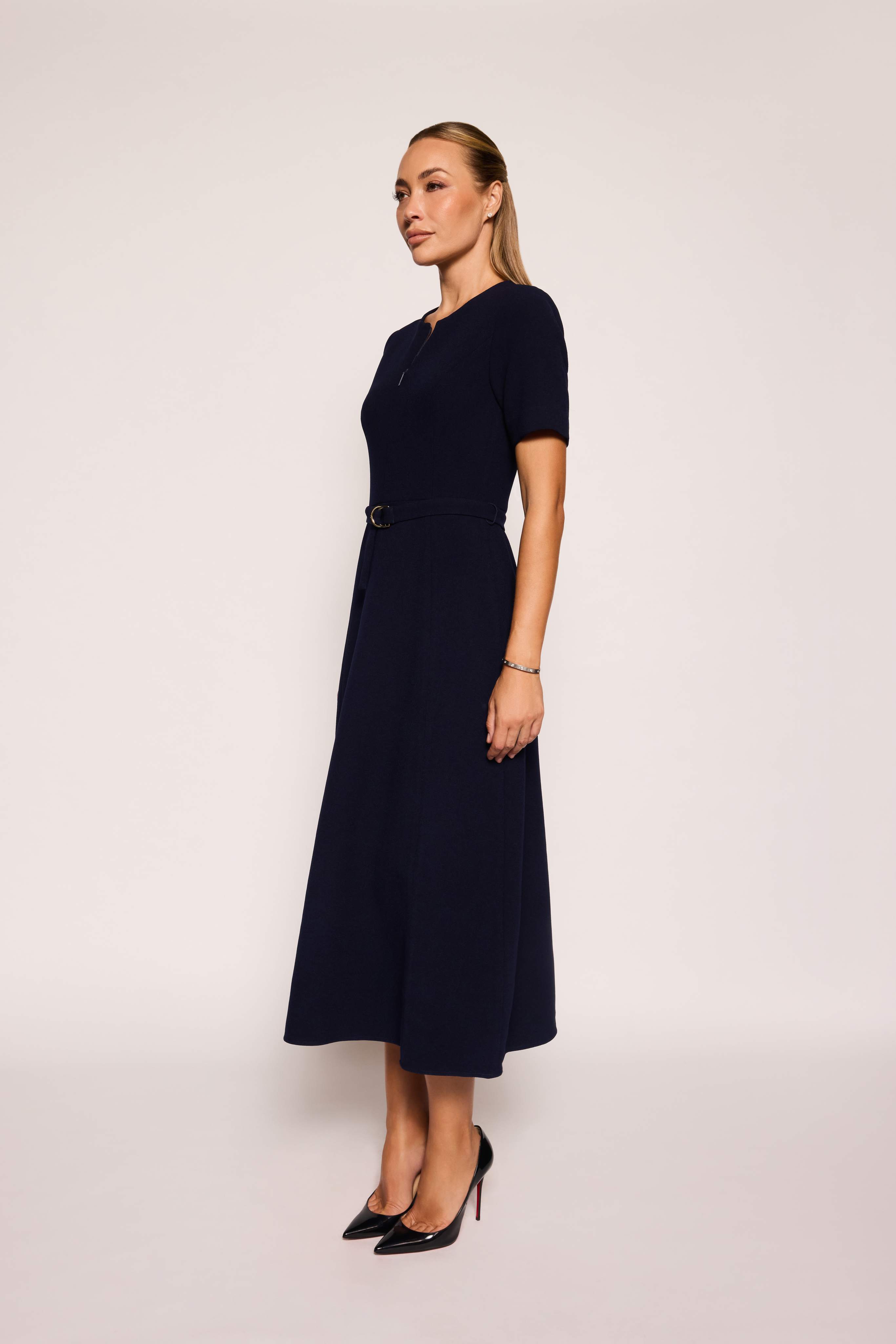 The detailed Deputy dress, working zip front detail, with a slim waist-defining belt secured with KG buckle. Elegantly flowing a mid-length A-line skirt.