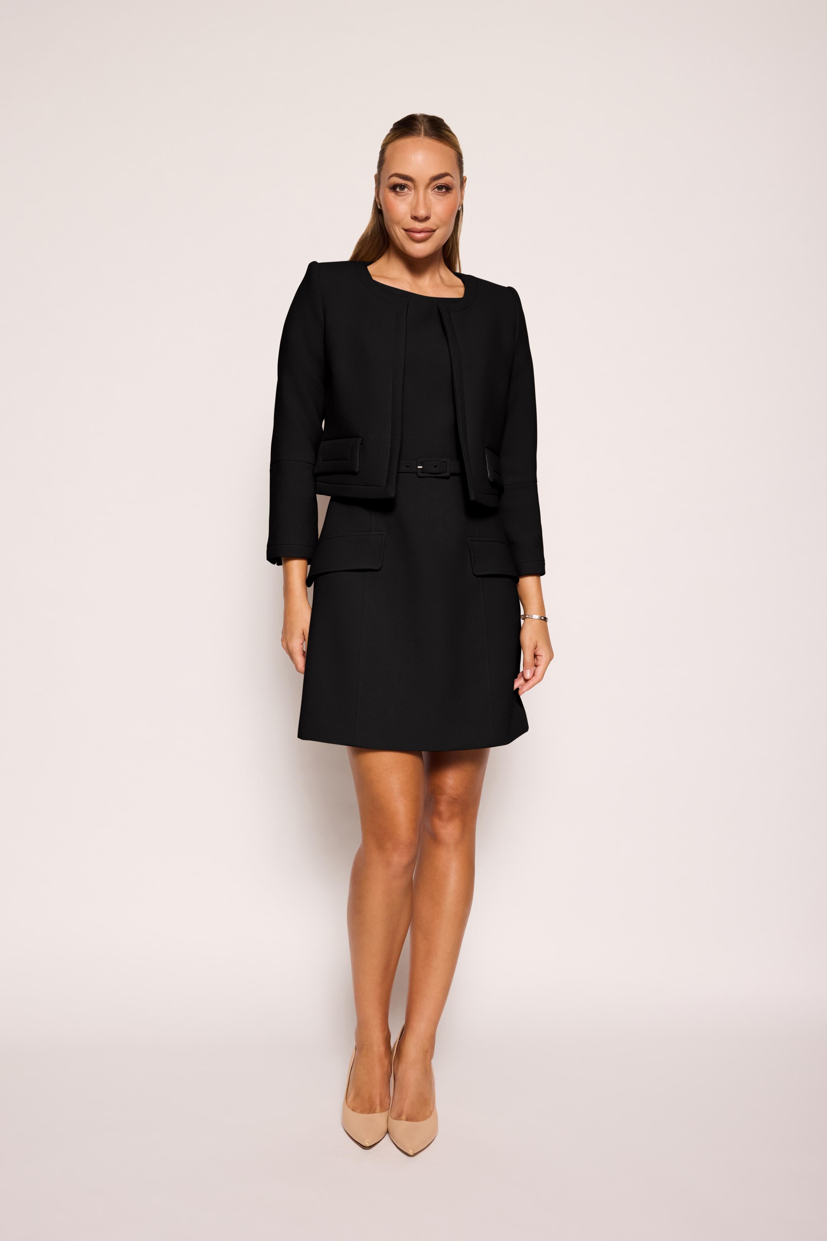 The Essie Jacket in Black is a sophisticated addition to your wardrobe, designed with a cropped silhouette that flatters every figure. Featuring distinctive three-quarter sleeves and elegant pocket detailing, this jacket seamlessly blends style with function. Its versatile design makes it an ideal layering piece over dresses or tailored outfits, adding refined charm and a polished finish. Crafted to elevate your look with understated grace, the Essie Jacket offers both comfort and timeless appeal for any occasion.