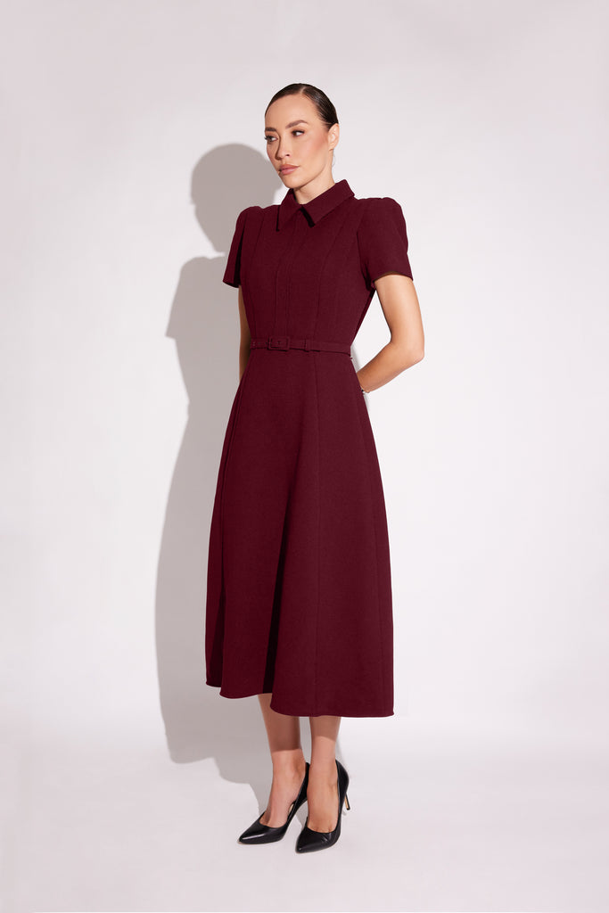 A exquisitely crafted A-line dress featuring a captivating statement collar and intricate front detailing. The waistline is artfully cinched with a slender belt, accentuated by meticulously structured paneling for a truly refined silhouette.