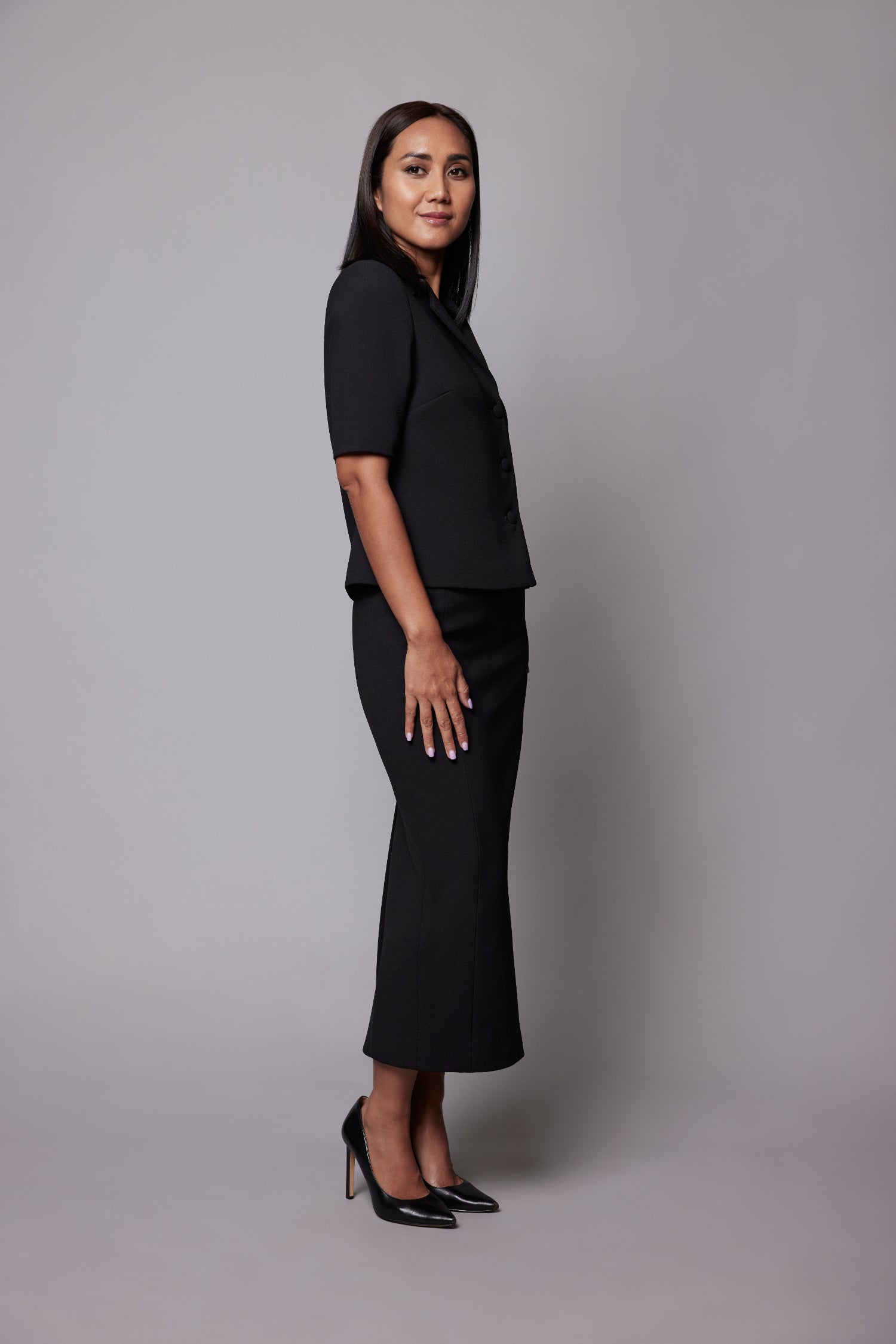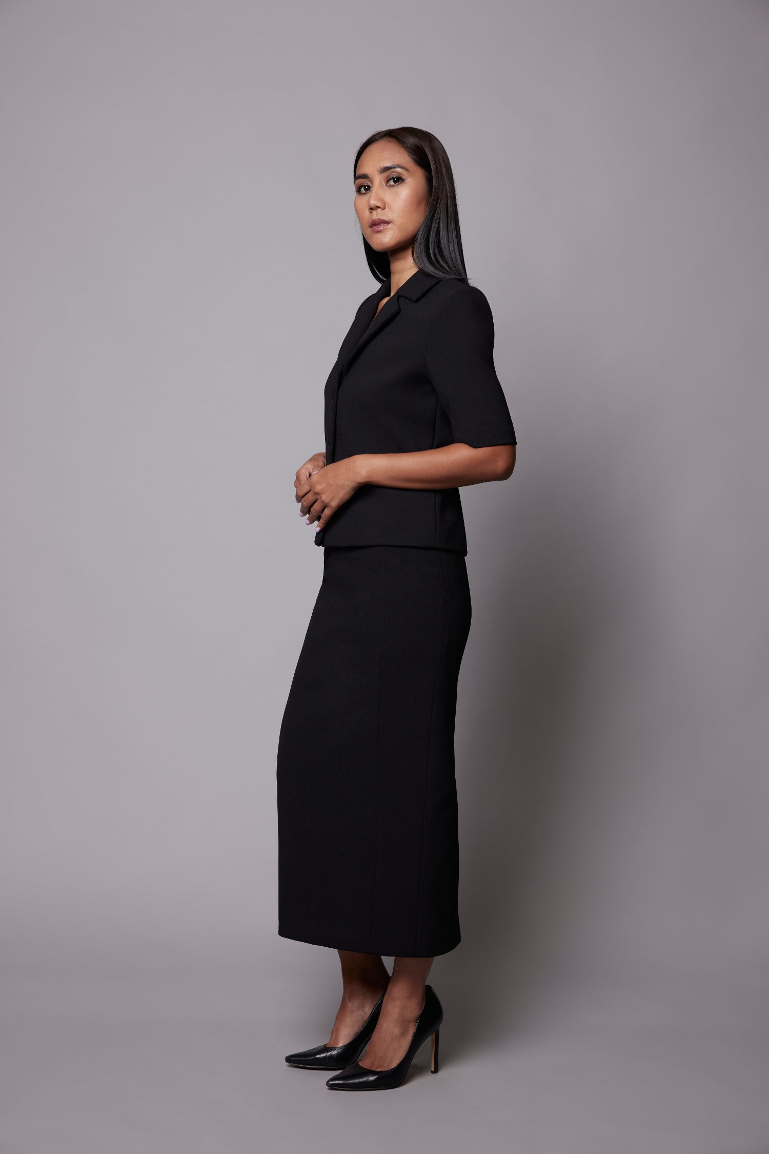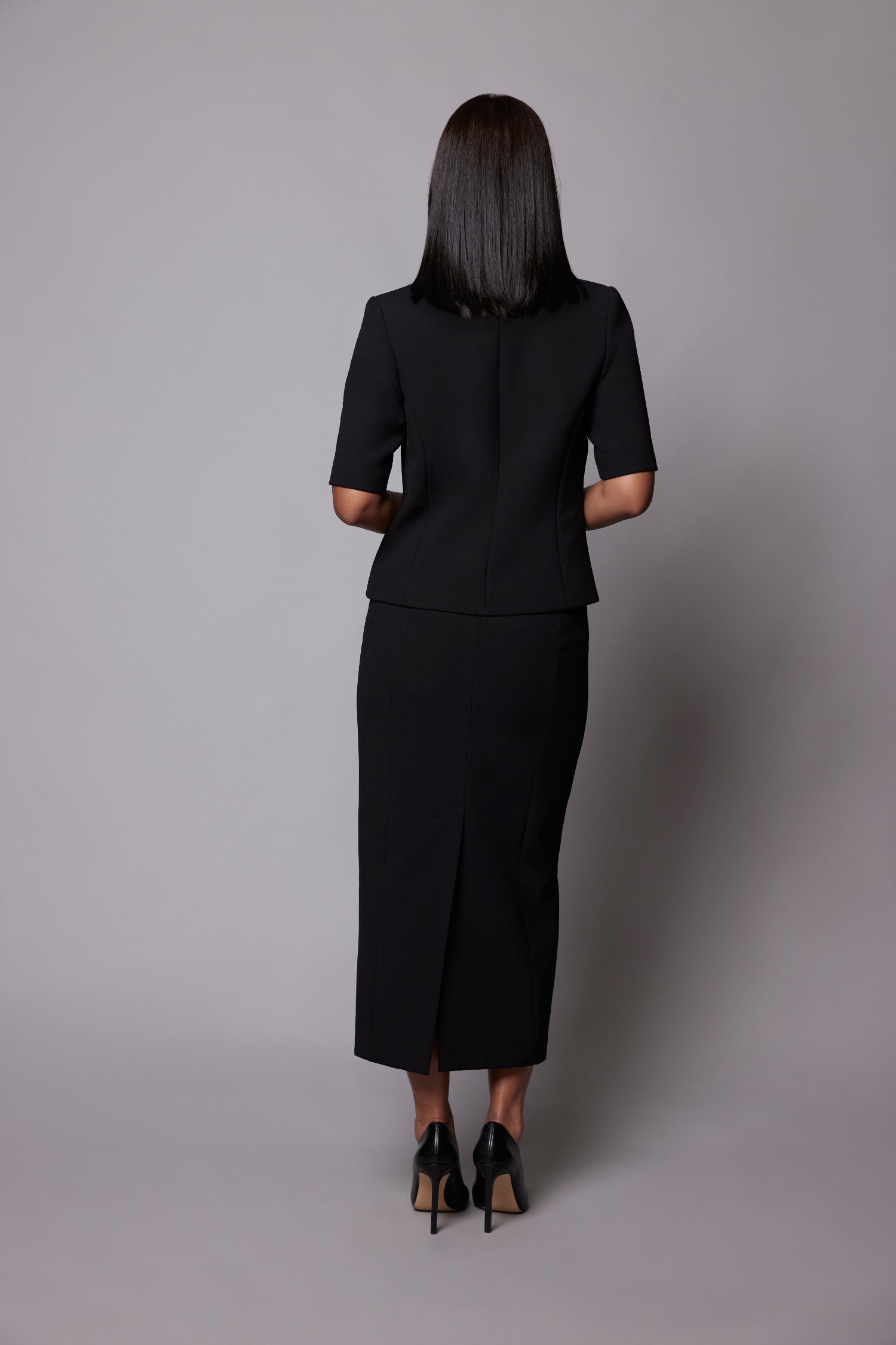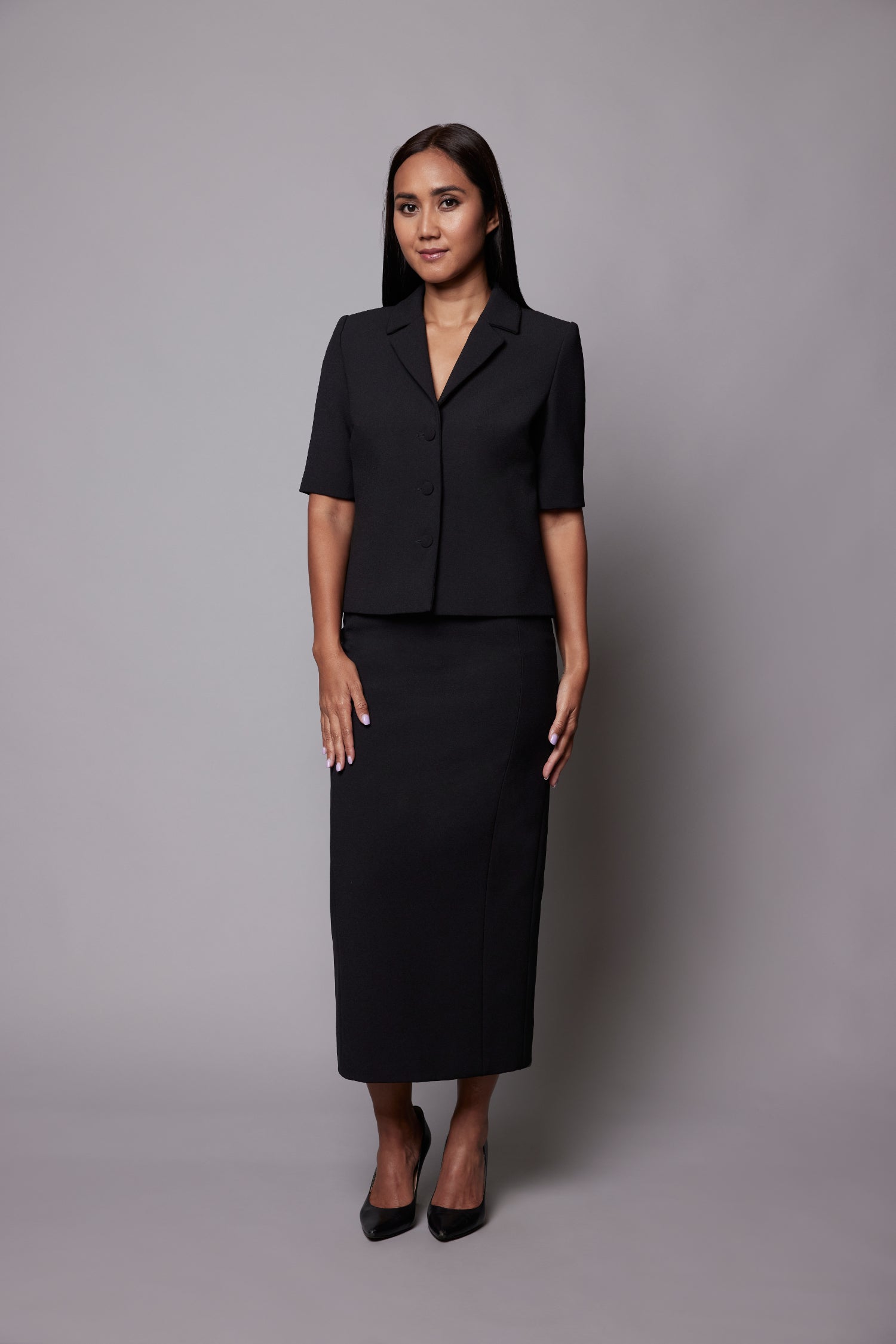 Short sleeved tailored jacket, with covered buttons, the perfect pairing to any KG skirt.