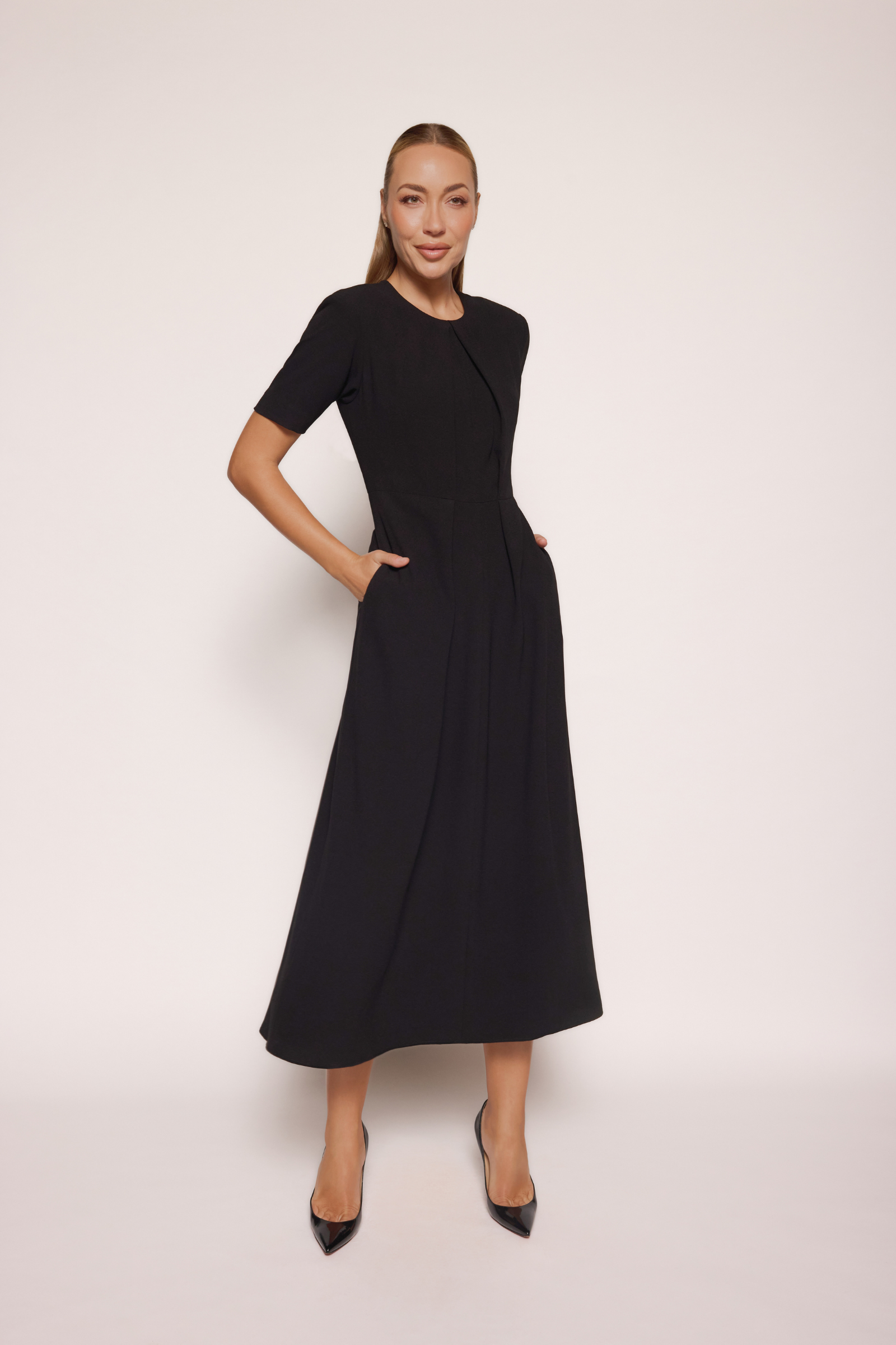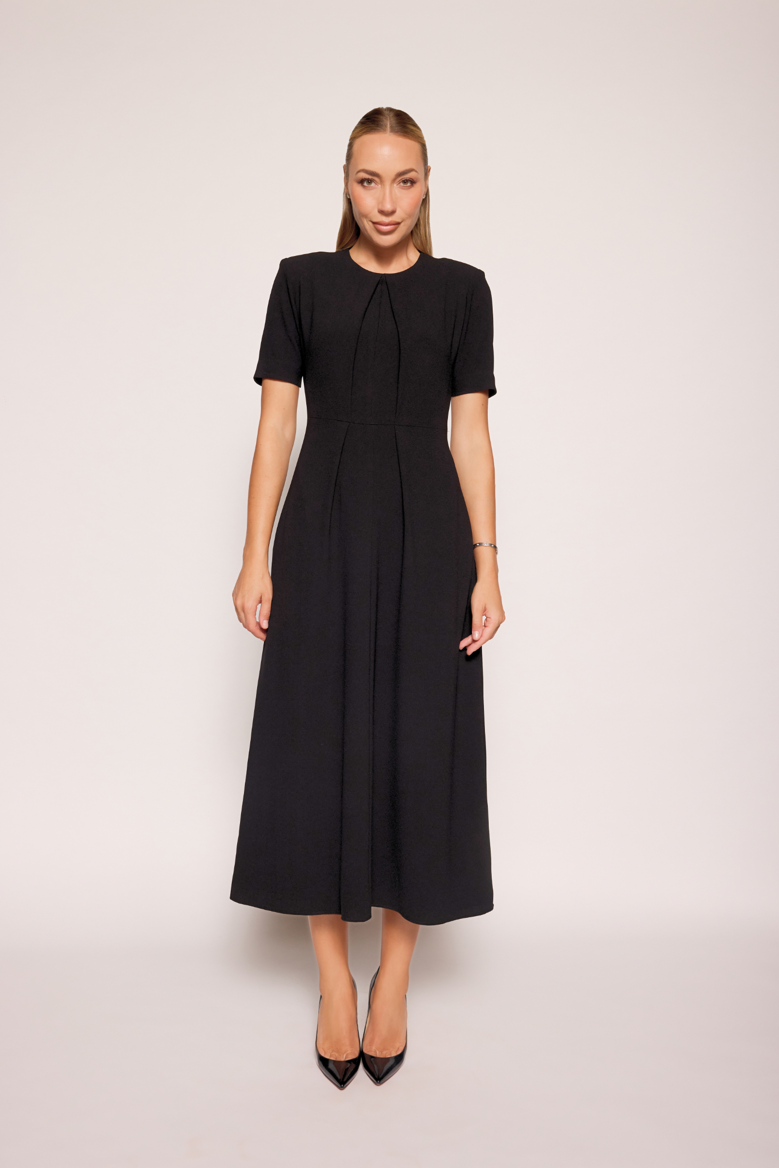 Elevate your wardrobe with the Lumi Dress in black, featuring elegant folden detailing from collar to hem. This sophisticated piece showcases a round neck, short sleeves, and a mid-calf A-line silhouette, effortlessly combining classic style with modern refinement for a polished look.