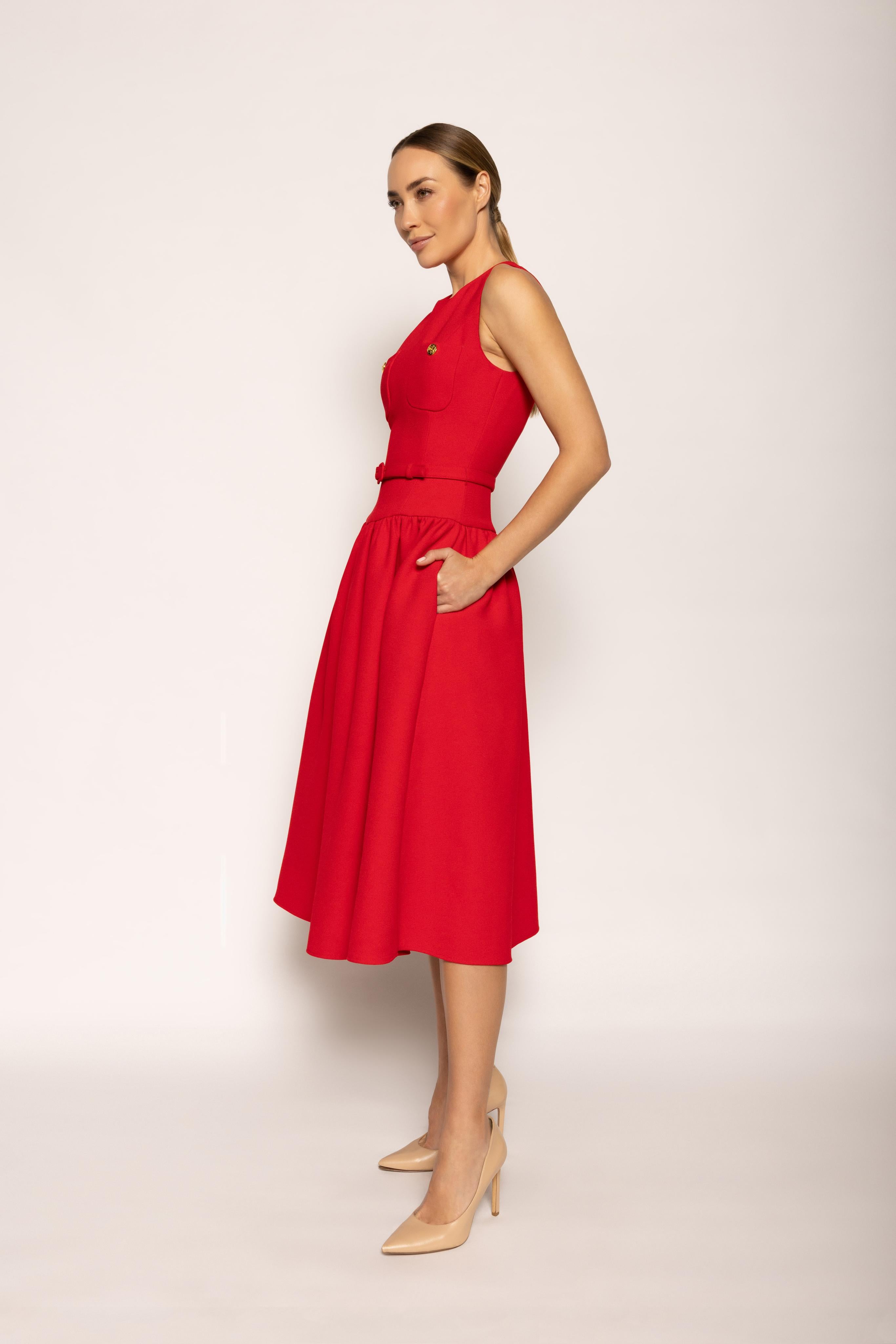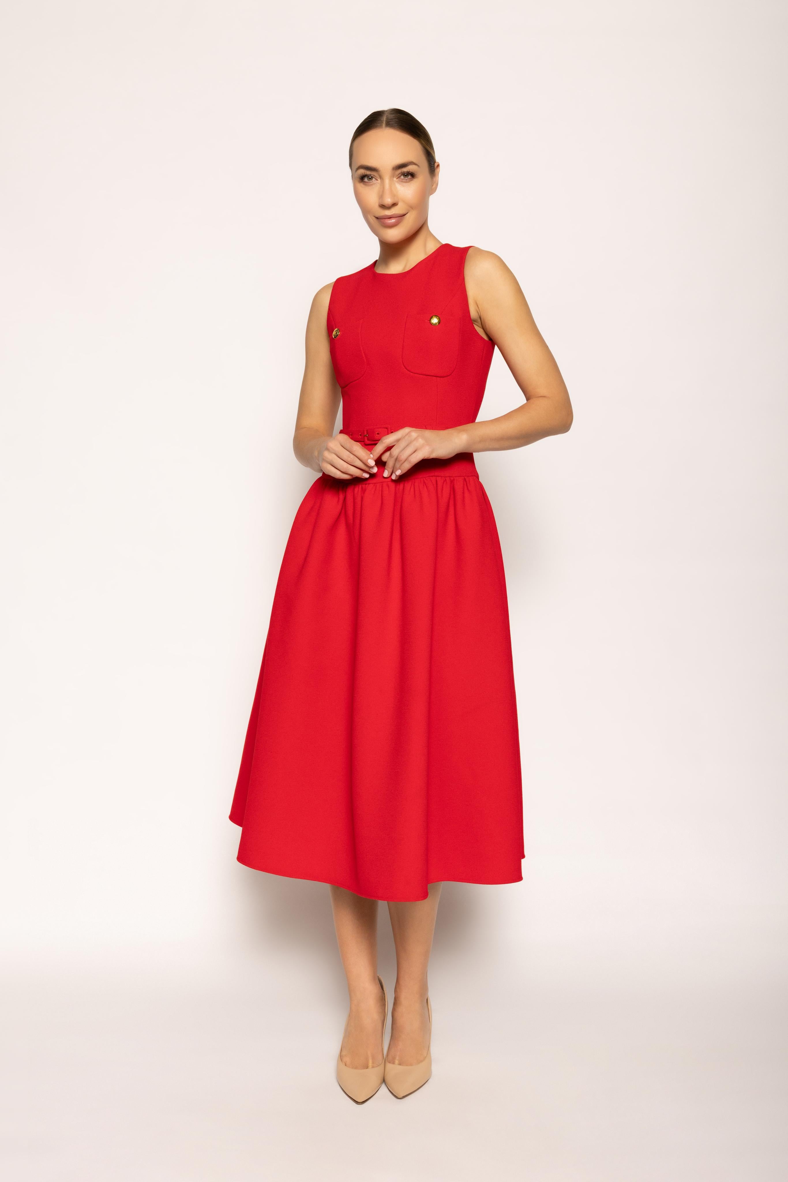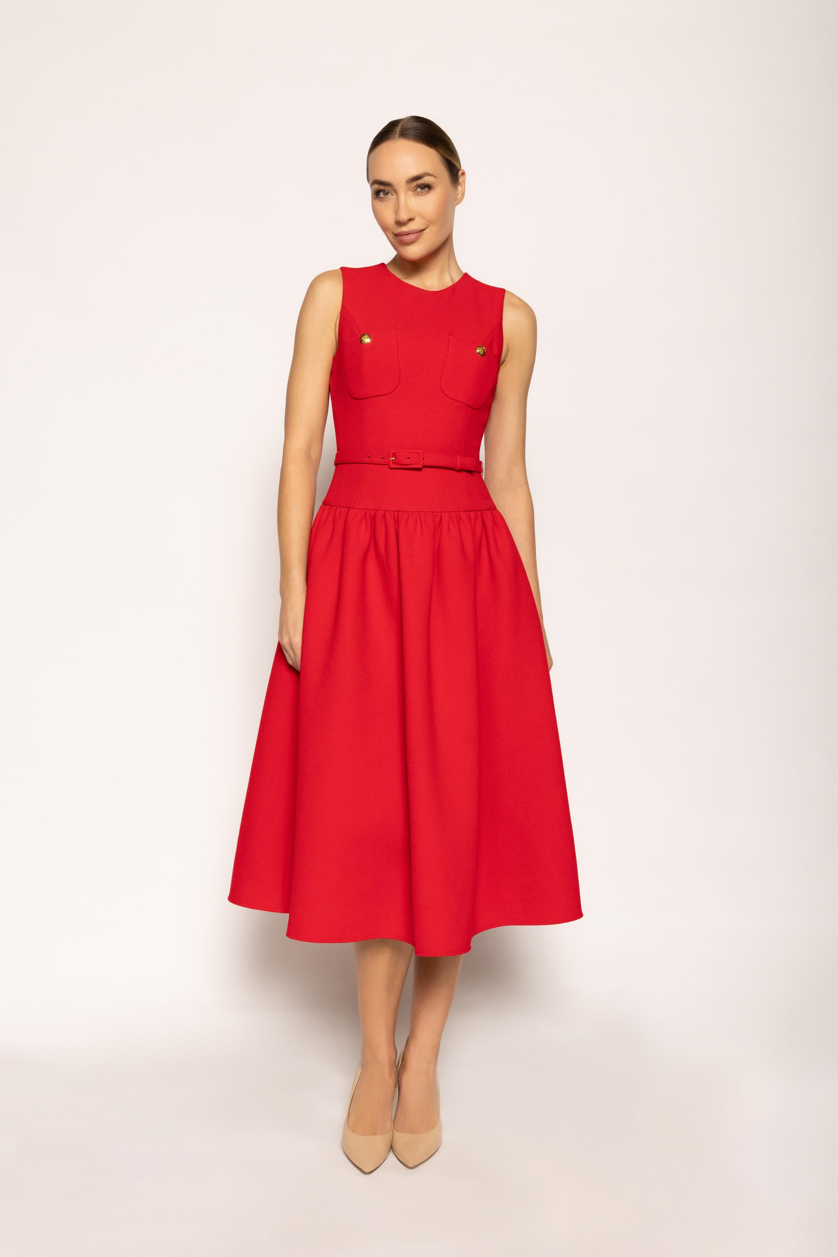 The Mara Dress combines timeless elegance with thoughtful design details. This sophisticated piece features a flattering drop waist silhouette that creates a refined, elongated line, while polished gold buttons provide a luxe finishing touch. The just-below-knee length offers versatile styling for both professional and social occasions. A true wardrobe essential that balances classic sophistication with modern practicality.