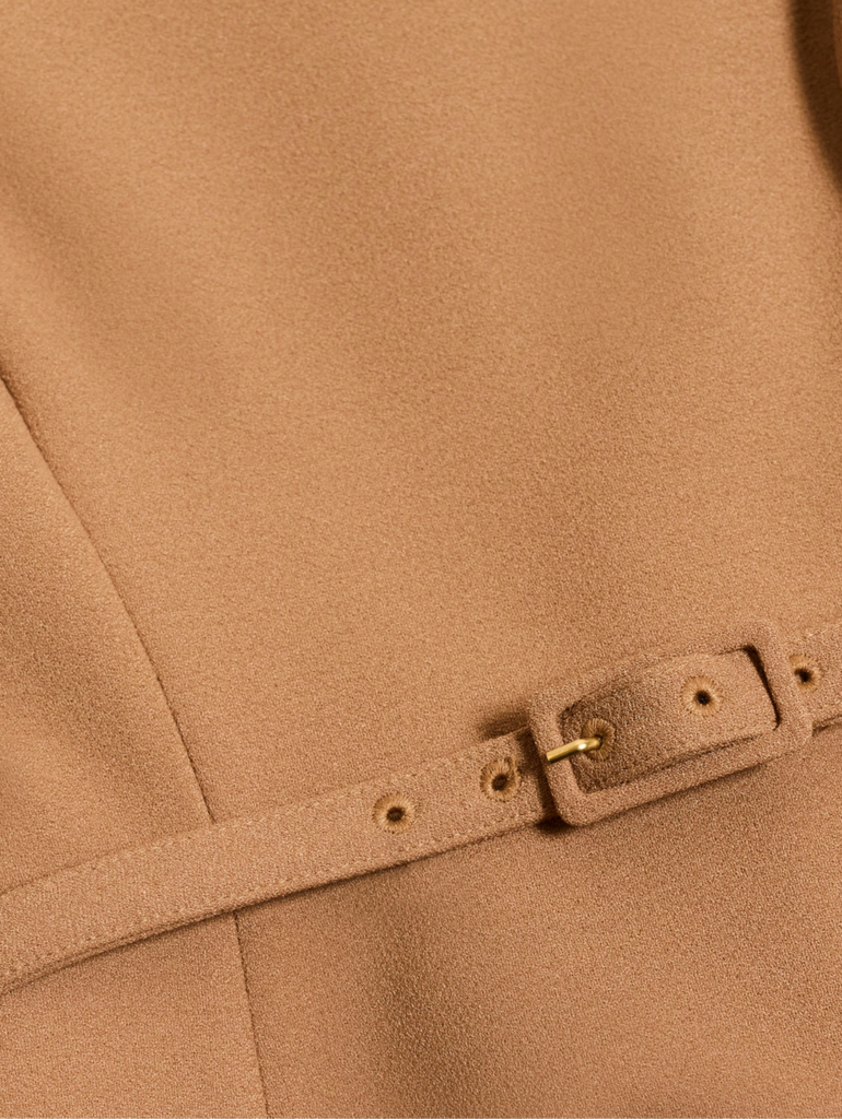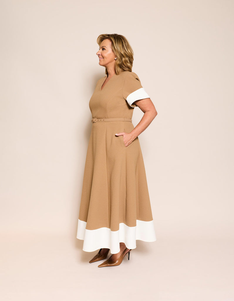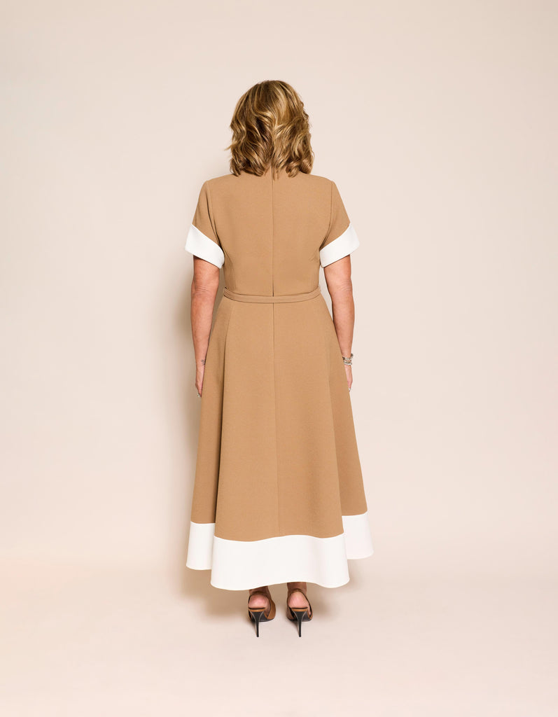 The Martina Dress from the Chyka Edit presents a refined tan V-neck silhouette, accented by crisp white sleeve cuffs, a signature KG belt, and a contrasting white band along the hem, enhanced with convenient pockets for effortless style.