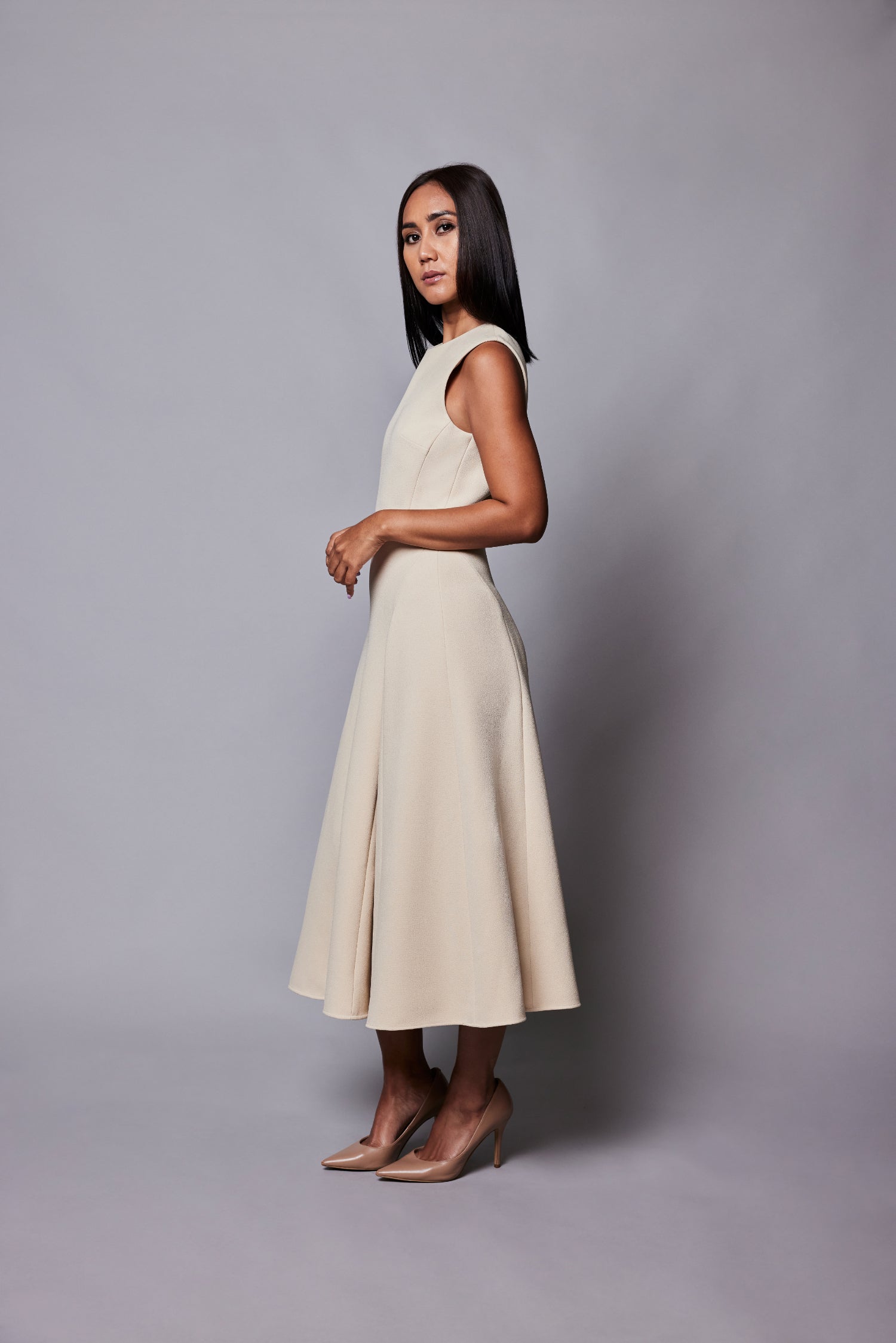 Structured pannelled top with A-Line skirt and godet detail, allowing the skirt to flow and move with every step.