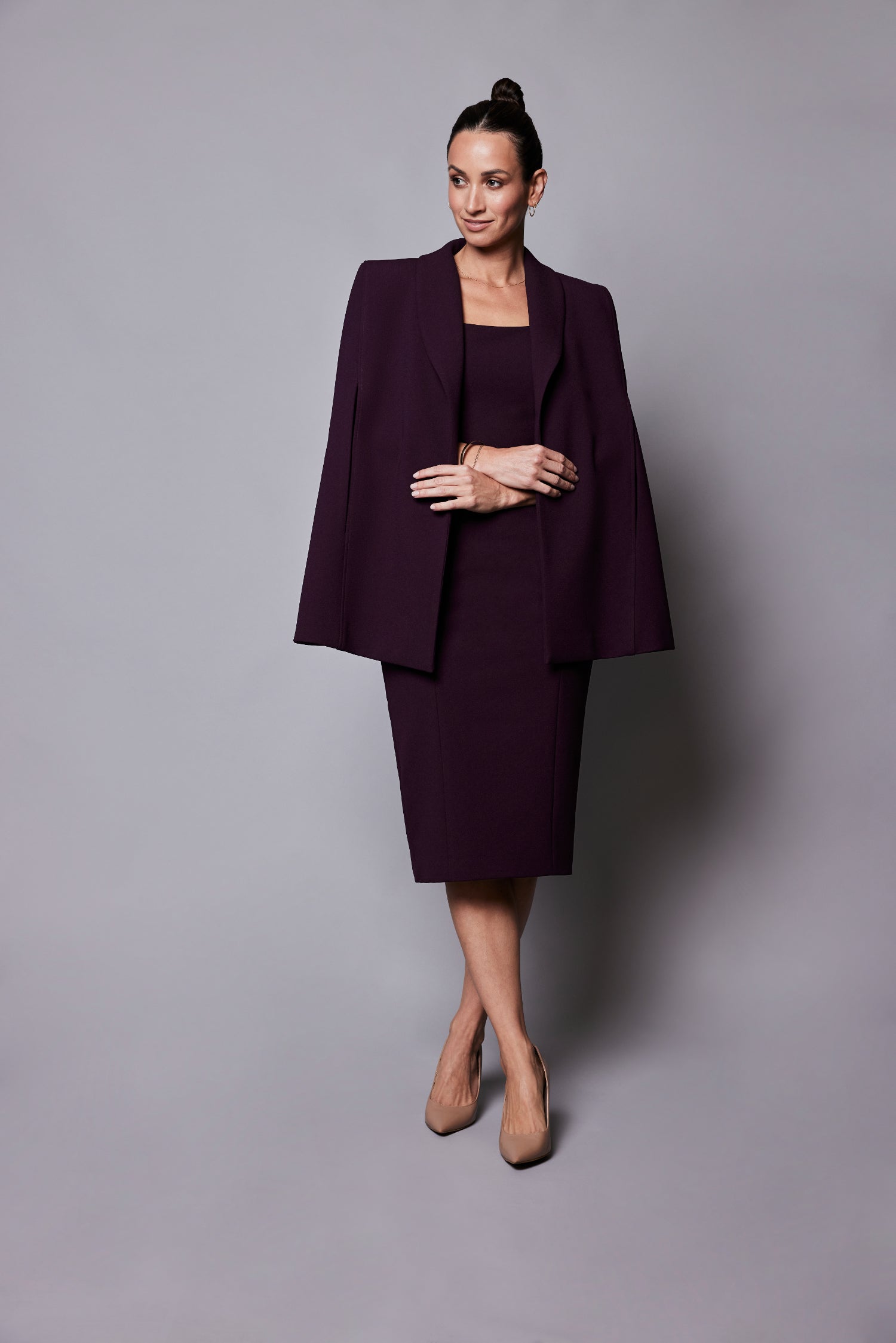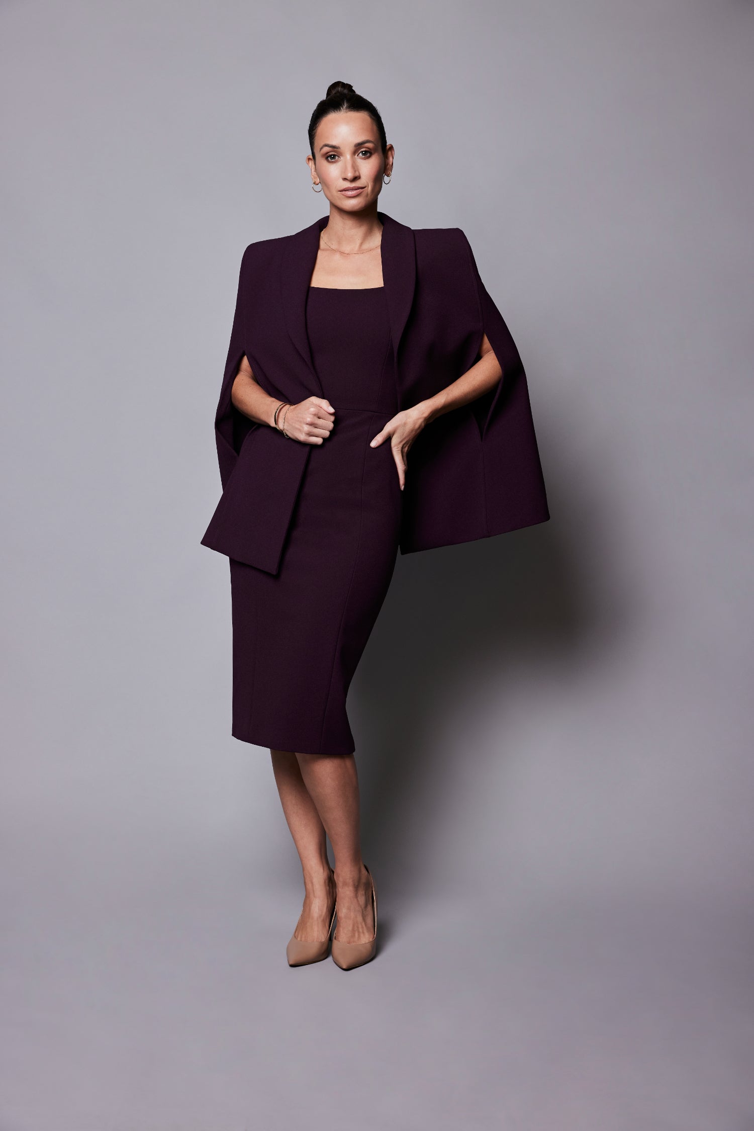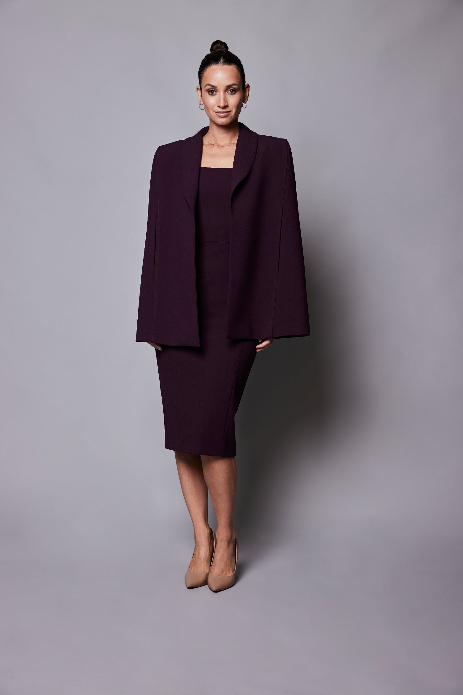 Structured open cape that rests simply on your shoulders, strategic panneling and fully lined to elegantly complete any look.