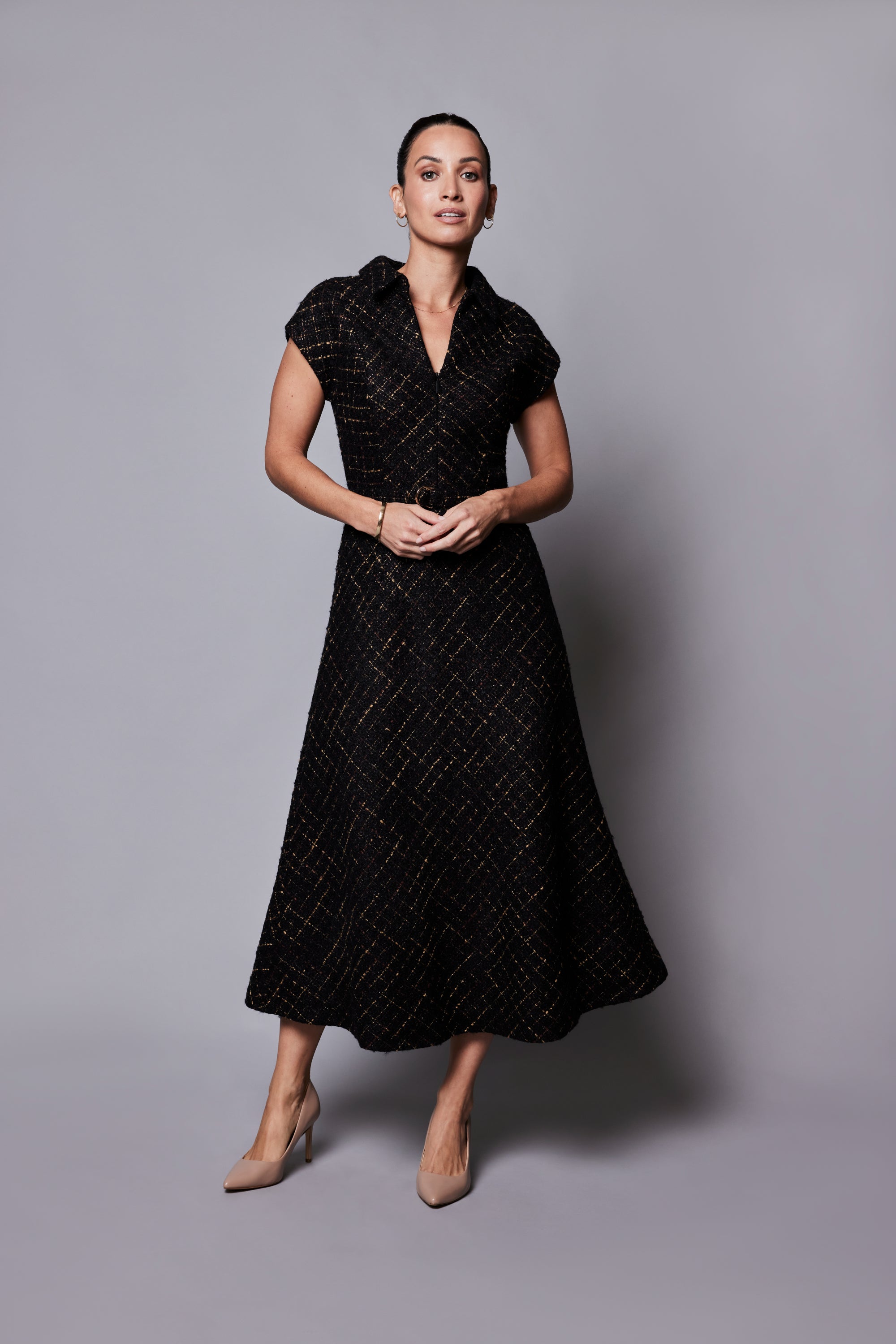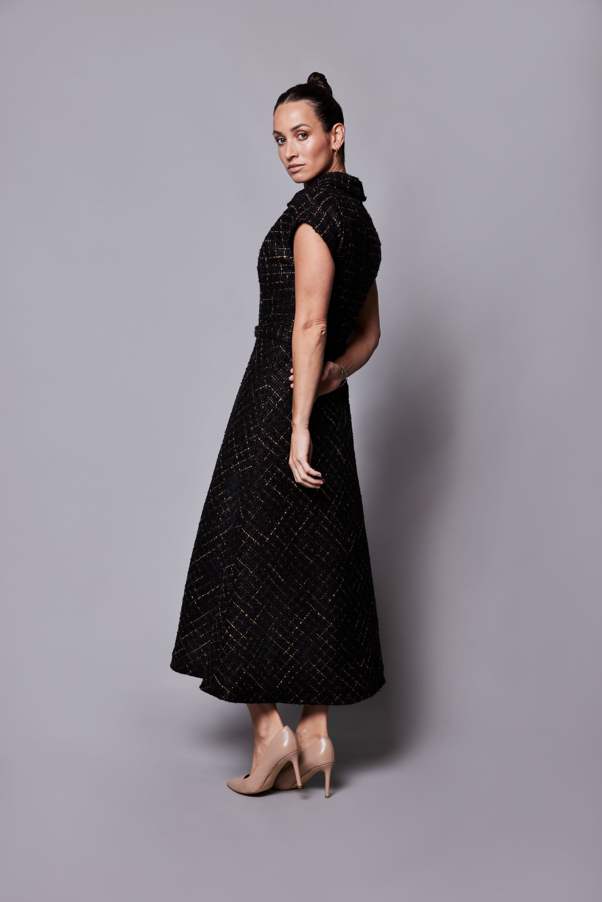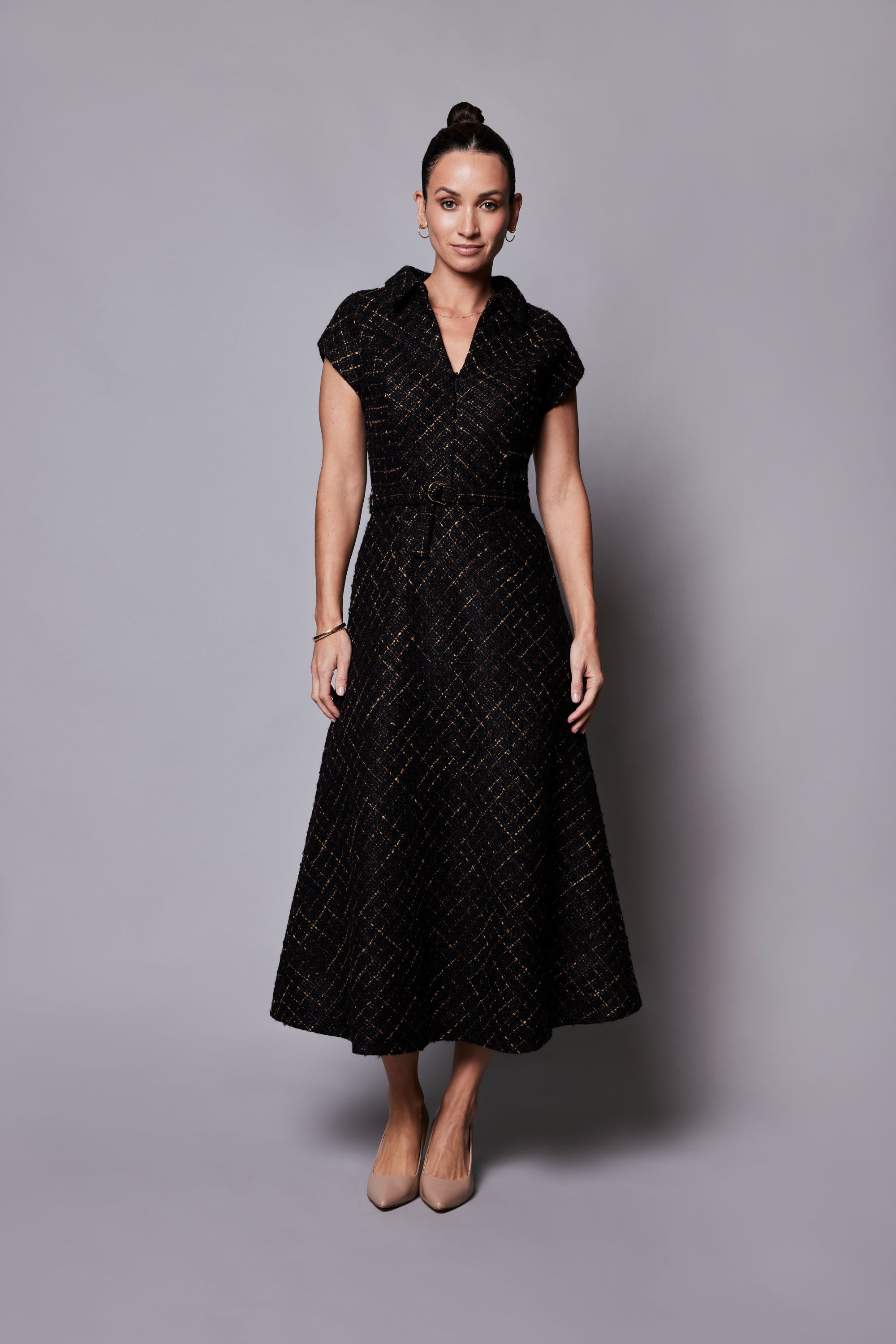 The Poppy Tweed dress combines a deep V-neckline collar with elegant cap sleeves for a refined silhouette. Its belted waist enhances shape, while the mid-calf length maintains a timeless and sophisticated look. Crafted from textured tweed, this dress balances classic tailoring with modern style for versatile wear.