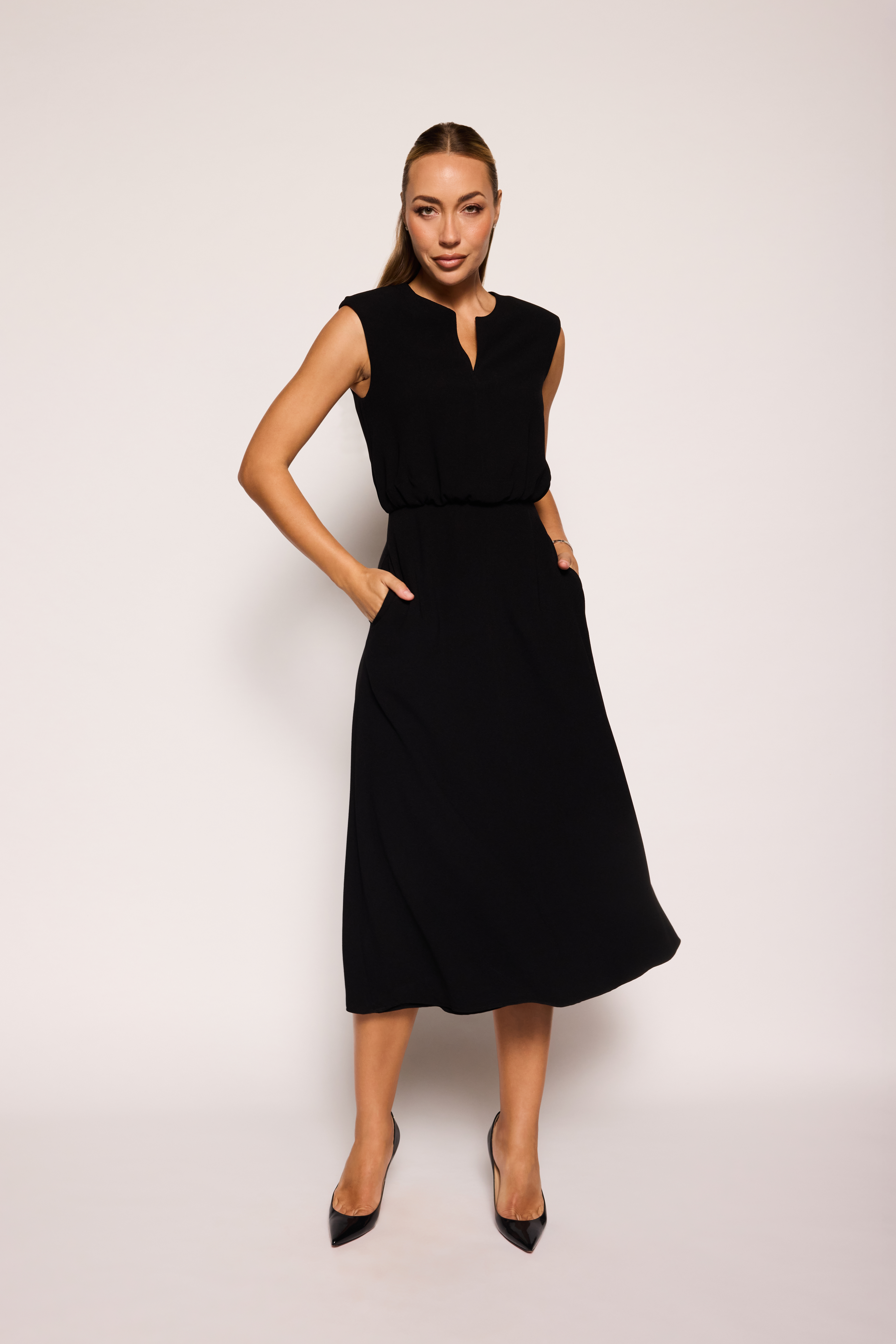 Effortlessly elegant, the Provence Dress transitions seamlessly from office to weekend. This sleeveless V-neck design features a refined slit detail and a gently shaped bodice crafted from lightweight fabric that defines your waist. The flowing A-line skirt moves gracefully with every step, offering understated sophistication for any occasion. A timeless piece that balances structure with fluidity.