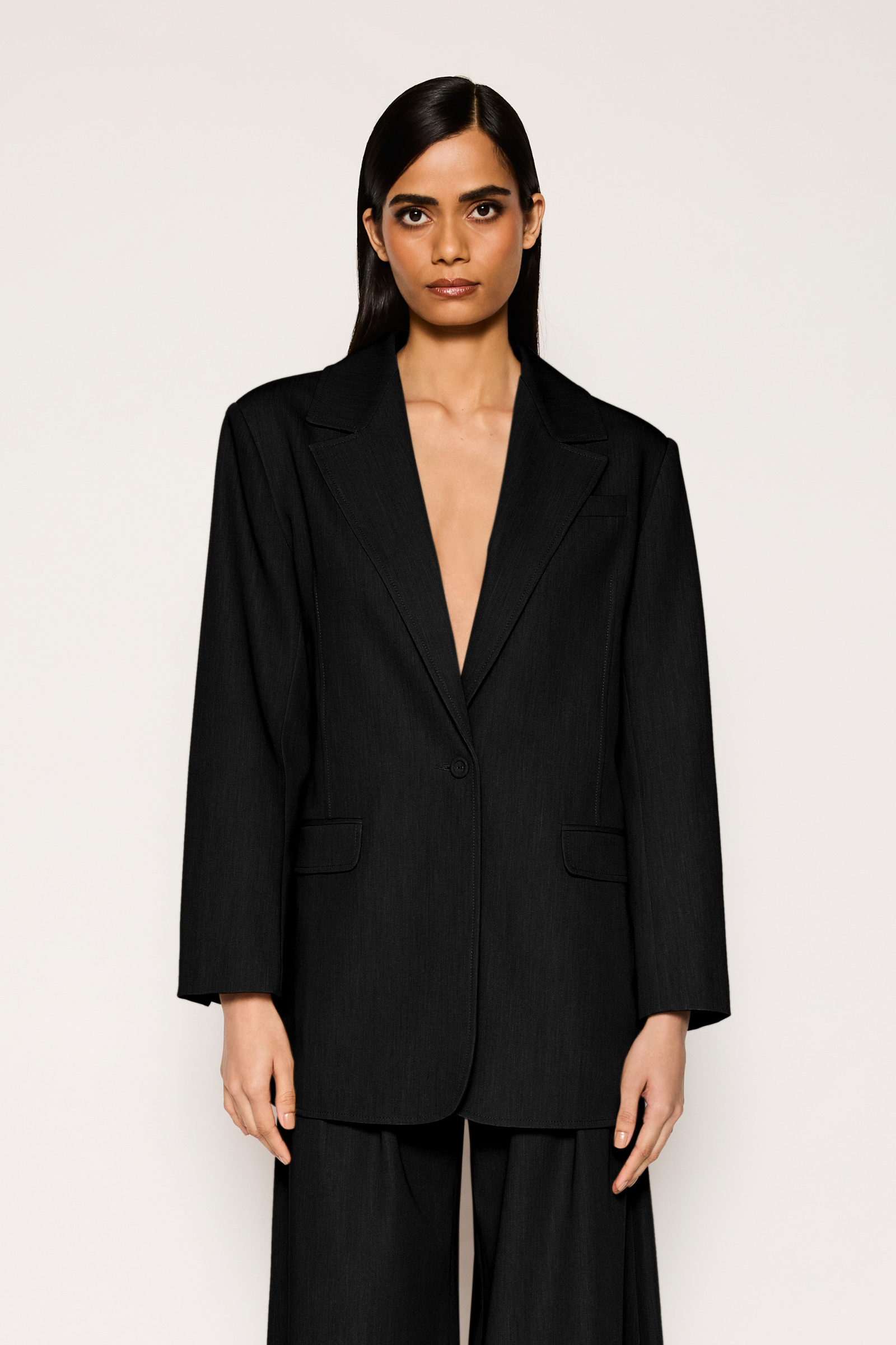 An oversized, structured blazer that exudes effortless sophistication. Tailored to precision in suiting fabric, it transitions seamlessly from a sharp suit to a relaxed weekend look.