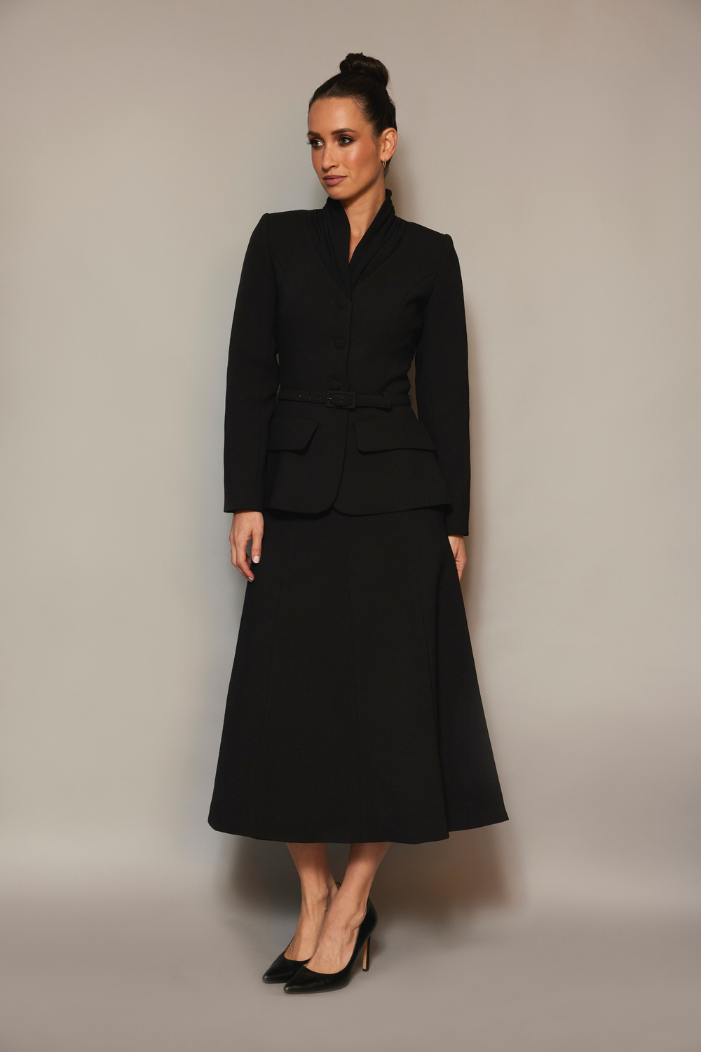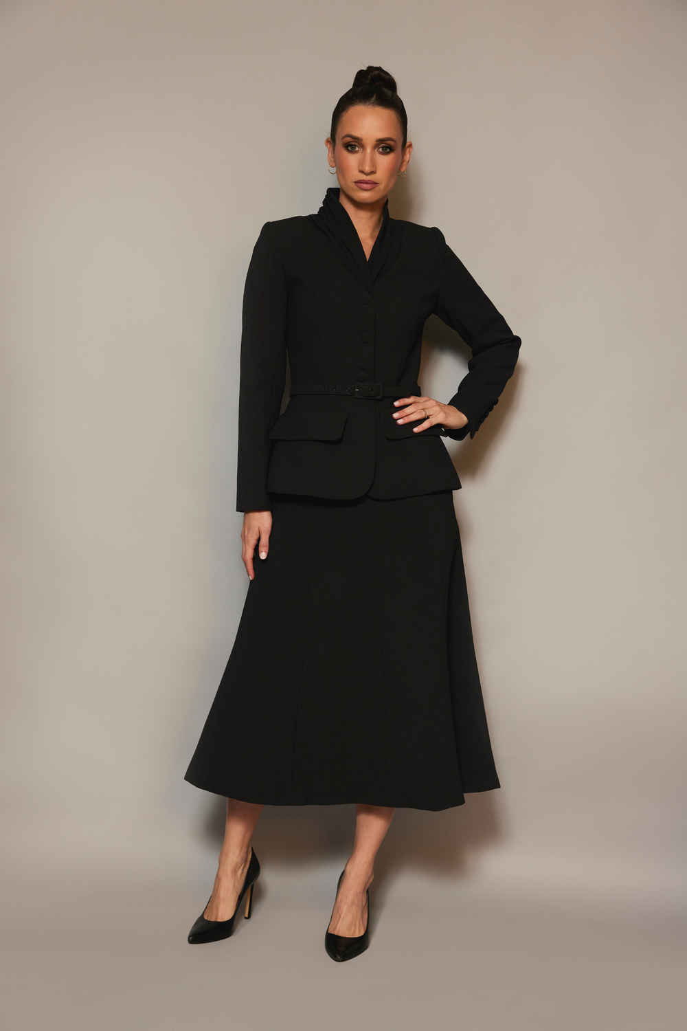 A beautiful tailored jacket with covered buttons, slight peplum bottom, finished with two pockets. The waistline is delicately nipped in with a narrow belt and structured paneling, perfect for dressing up or down on any occasion.